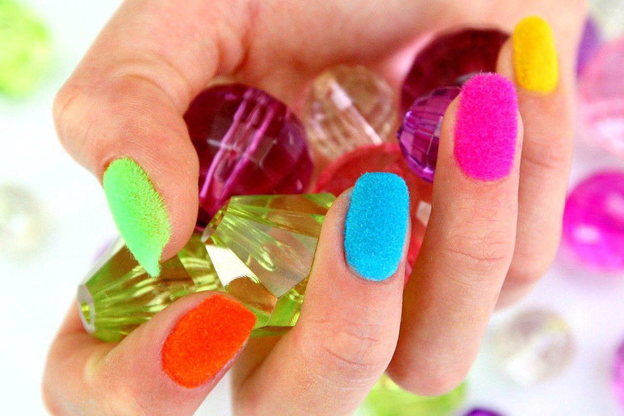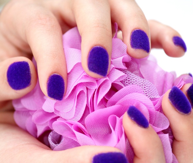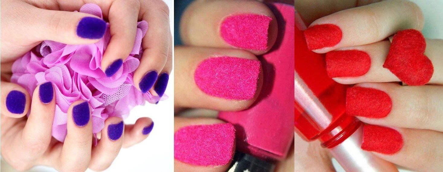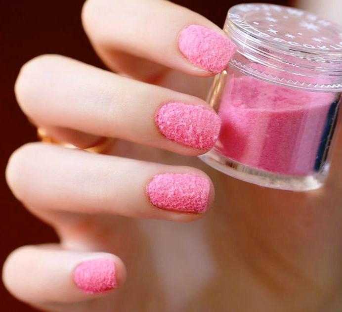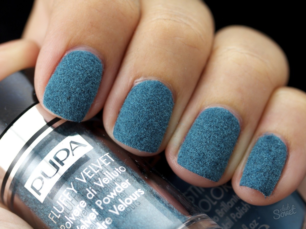 La manucure Velvet est présentée sur le marché dans toutes les nuances de couleurs. Mais en réalité, il s’agit d’une petite pulvérisation de molleton appliquée sur la plaque d’ongle avec une brosse. Cela permet aux modeuses de faire la manucure en velours originale de leurs propres mains. La longueur de la pile dans le revêtement de velours est différente et la texture peut également différer les unes des autres. Il existe des fibres de laine, de viscose et de coton. Ils ont l'air complètement différent. Vous pouvez acheter un ensemble de manucure de velours dans n'importe quel magasin de nail art ou commander en ligne.