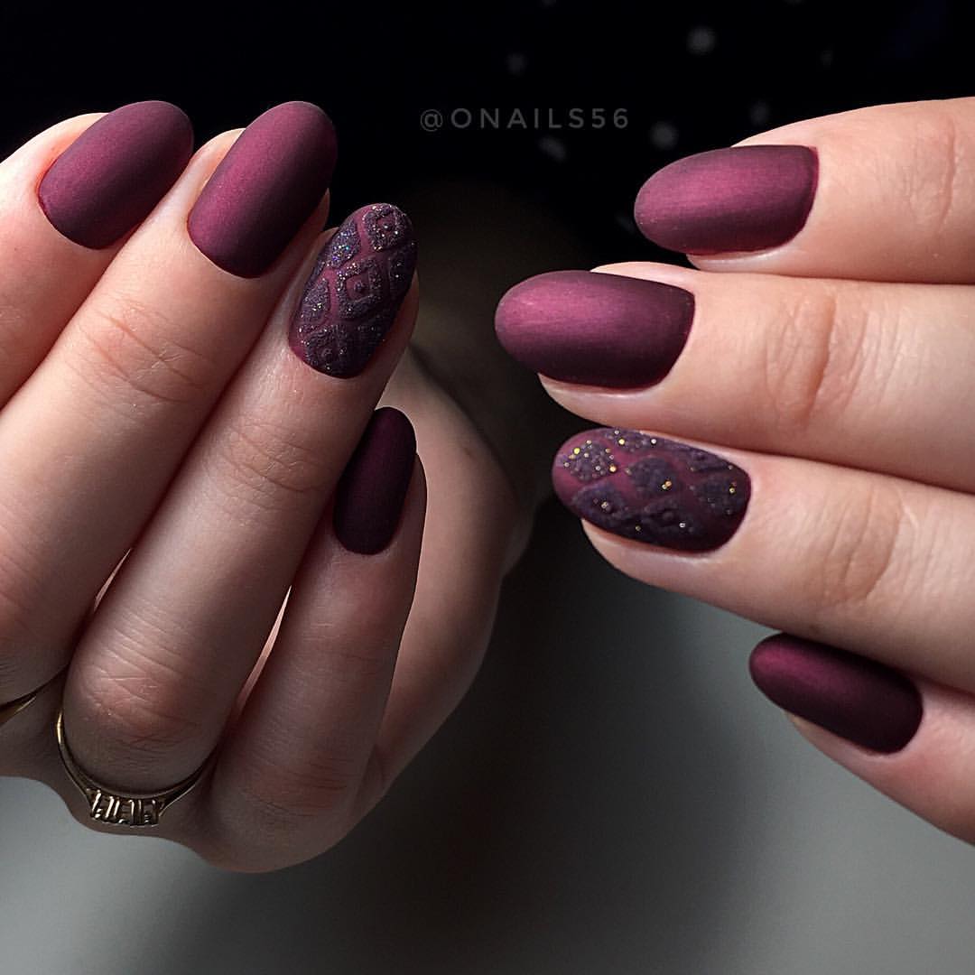Si vous souhaitez que vos ongles soient élégants et délicats, veillez à utiliser un enduit de velours ressemblant à un tas de peluche d'un chaton britannique en peluche. Le revêtement d'une seule pièce de texture de velours est l'une des options de manucure. Même dans un design uni, les ongles en velours ont l’air élégant et moderne. Si vous avez choisi une couche de base de la même couleur que le velours, alors vous l'avez fait correctement. Lorsque les fibres sont effacées et que cette gêne se produit presque le lendemain, la base laquée ton sur ton avec poil est très utile. En raison de la nuance uniforme du vernis et du poil, les copeaux et les vides points chauves ne sont absolument pas visibles. Nous vous suggérons d’examiner les meilleures options de manucure en velours sur la photo ci-dessous.