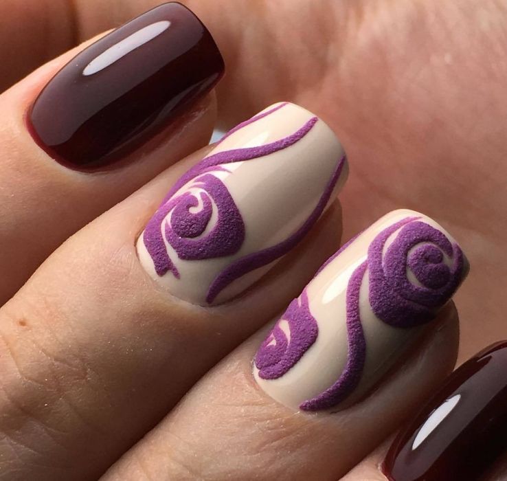 La manucure en velours a bien meilleure apparence lorsque l’ongle féminin n’est pas trop long. La manucure de velours dans diverses nuances à la mode est très douce et agréable au toucher. Les teintes sombres du revêtement de velours se marient à merveille avec les tons pastel. Le rose cette année peut souligner le rose pâle et le bleu combiné au marron. Lorsque vous choisissez une teinte de manucure en velours, il est très important de prendre en compte les couleurs des vêtements.
