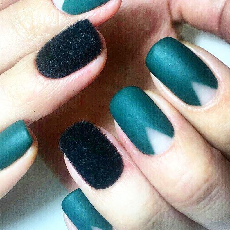 La manucure de velours est très appropriée en automne et en hiver froids. Il peut être fabriqué avec n'importe quel jeu de couleurs et une variété de techniques. Un revêtement de poil peut être appliqué sur un clou ou seulement sur certaines de ses parties. Teintes quotidiennes pour la manucure de velours, les stylistes conseillent d'utiliser des teintes douces. Les couleurs accrocheuses sont préférables aux occasions spéciales. Merveilleusement bleu, poudré, sable, beige et même vert. Avec des couleurs neutres de manucure en velours, vous pouvez porter tous les produits de la garde-robe de base.