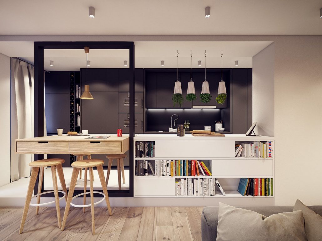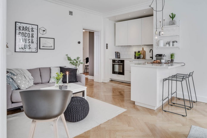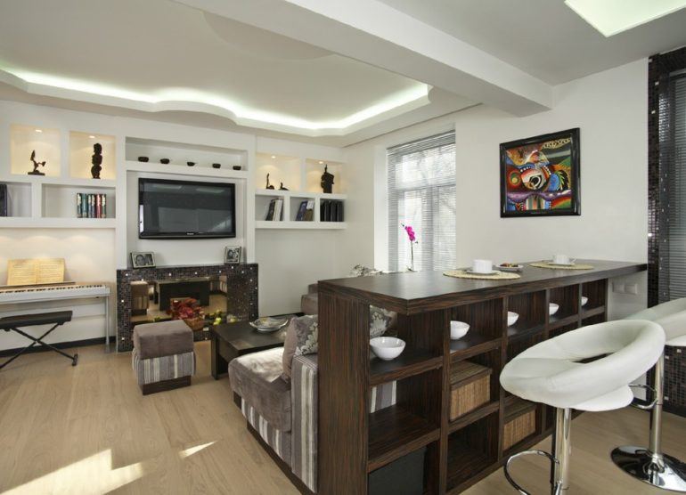 Ce style sera une aubaine pour les petits appartements. Le comptoir du bar sert de séparateur entre le salon et la cuisine. Son style, sa forme et ses couleurs doivent répéter les contours d'un ensemble de meubles. Dans une telle pièce, le comptoir peut remplacer avec succès la table à manger, ce qui la rendra pratique et ergonomique. À proximité, des chaises hautes auront fière allure.