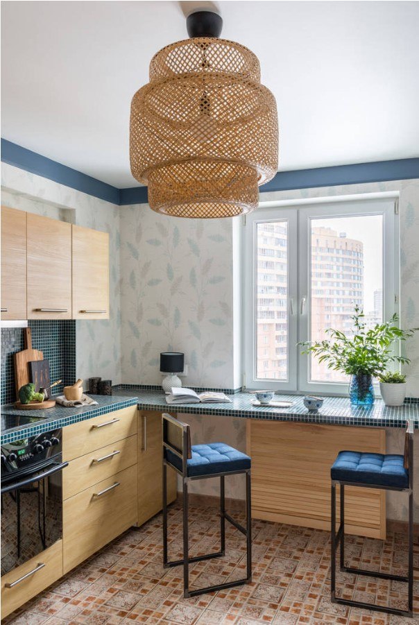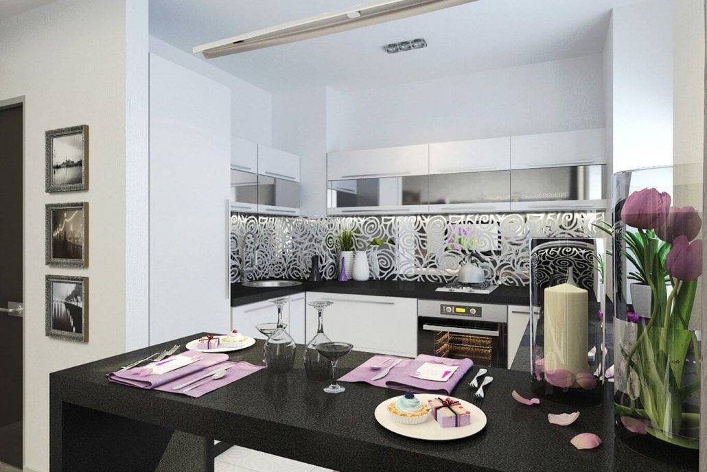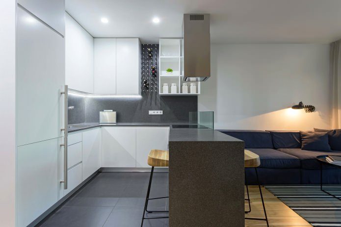À première vue, la cuisine est de taille modeste, le comptoir de bar sera inapproprié. Cependant, c'est loin d'être le cas, en particulier pour les petites familles.Dans ce cas, il peut être remplacé par une table à manger ou utilisé pour prendre un verre avec des amis.