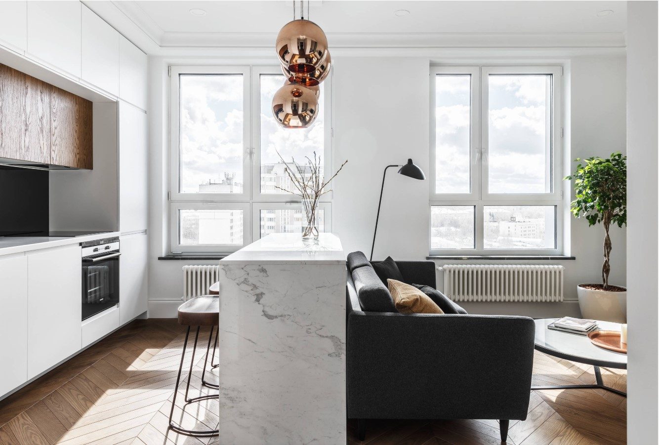 En outre, le comptoir sert de sorte de séparateur pour la cuisine et le salon. Contrairement aux arches populaires entre les pièces, il zonage l'espace sans effet encombrant.