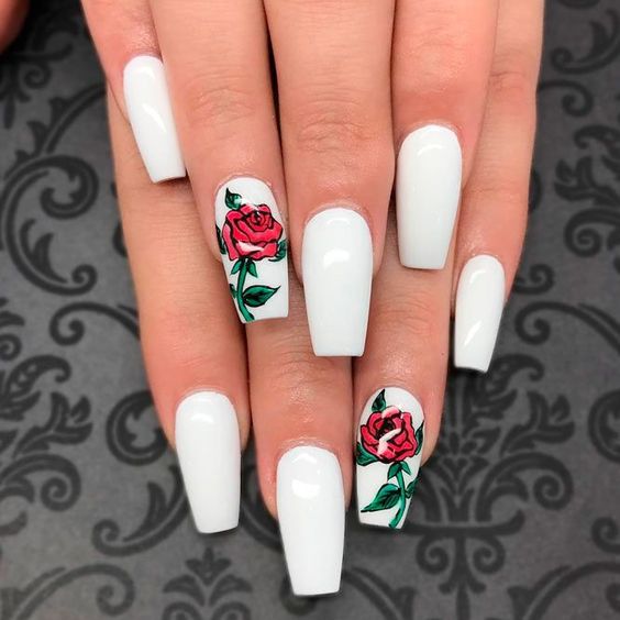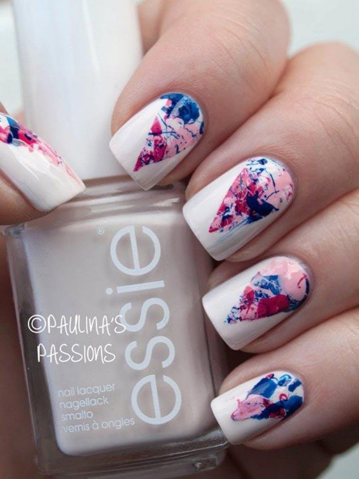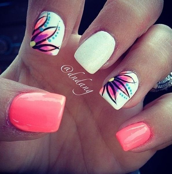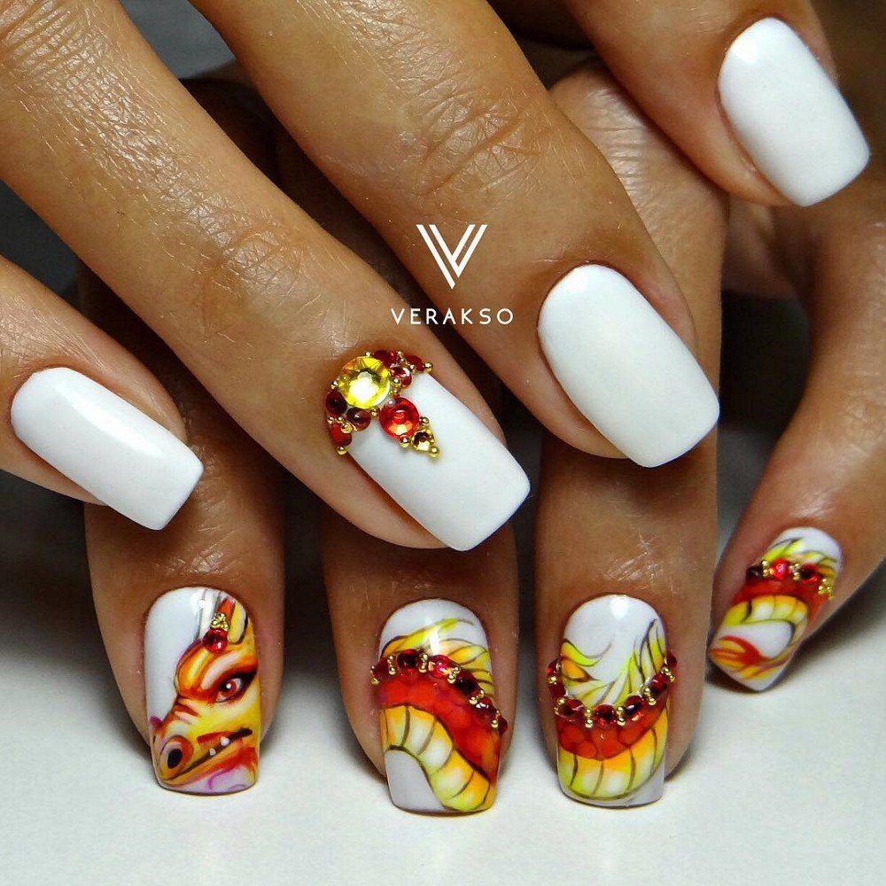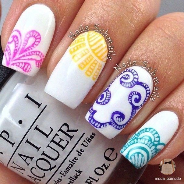 Les ongles, déjà recouverts d'une base blanche comme neige, peuvent être rafraîchis avec des ornements de couleurs vives. En été, des fleurs hétéroclites ornent des fleurs colorées sur un fond blanc. En automne, des motifs jaunes et rouges, en hiver, des pétales de flocons de neige et de guirlandes et, au printemps, des motifs verts s'épanouissent. Et tout cela ensemble fait de l’art à ongles blanc un lieu unique et dynamique. Choisissez un motif coloré et sa nuance correctement, en le combinant avec une garde-robe ou avec le ton du rouge à lèvres. Les femmes riches en émotions, extrêmement sociables, parfois sans retenue et même hostiles, préfèrent les imprimés brillants sur fond blanc. Les motifs colorés sur le vernis blanc, non seulement floraux, mais aussi animaux, sont très populaires.