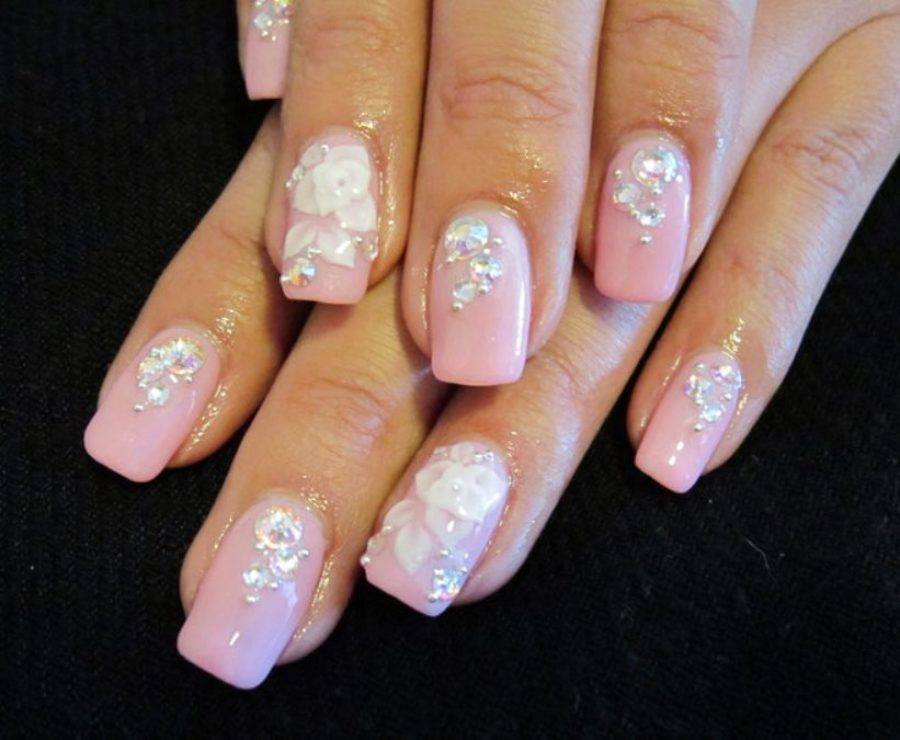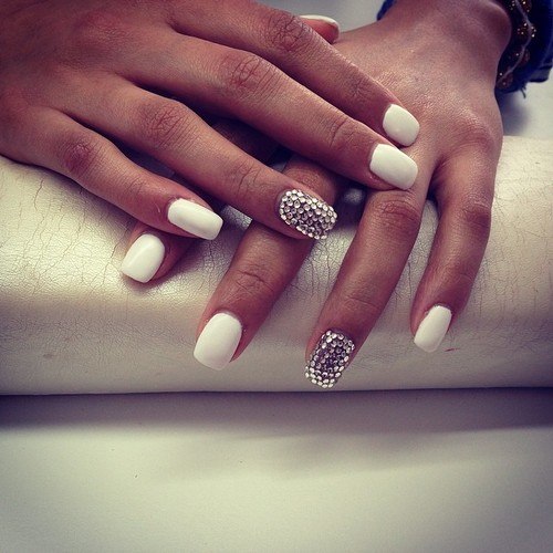 Manucure à la mode en blanc avec des strass et un éclat glamour.