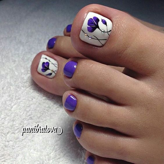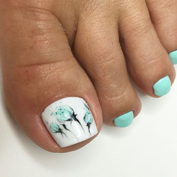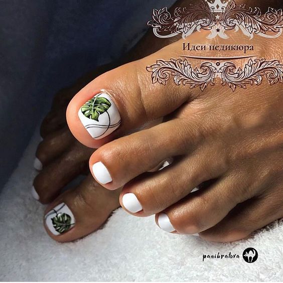 Si un pédicure blanc uni semble ennuyeux et inachevé, les experts en art des ongles vous conseillent de le compléter avec un imprimé floral ou des dessins de différentes plantes. Ainsi, la pédicure prendra vie et attirera une attention particulière. Vous pouvez créer de grandes, petites ou des moitiés de fleurs sur chaque ongle, mais il est préférable de décorer un pouce de cette façon et de laisser le reste blanc. Pour faire les mêmes fleurs ou d'autres plantes, vous pouvez appliquer l'estampage ou utiliser une variété d'autocollants.