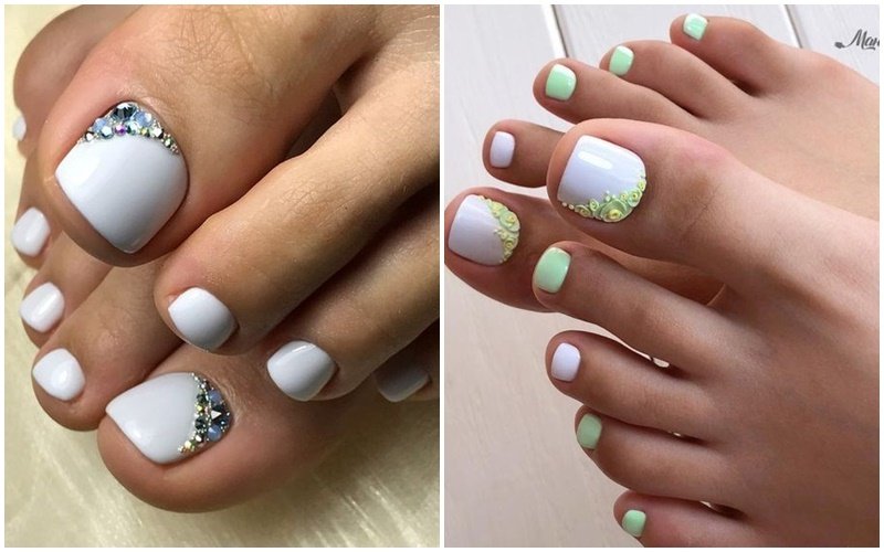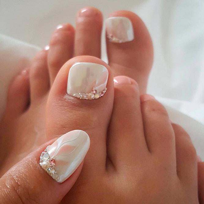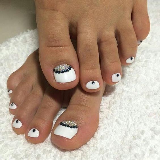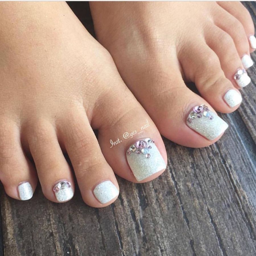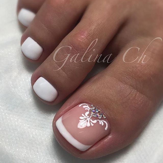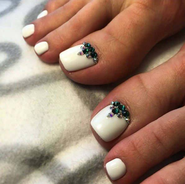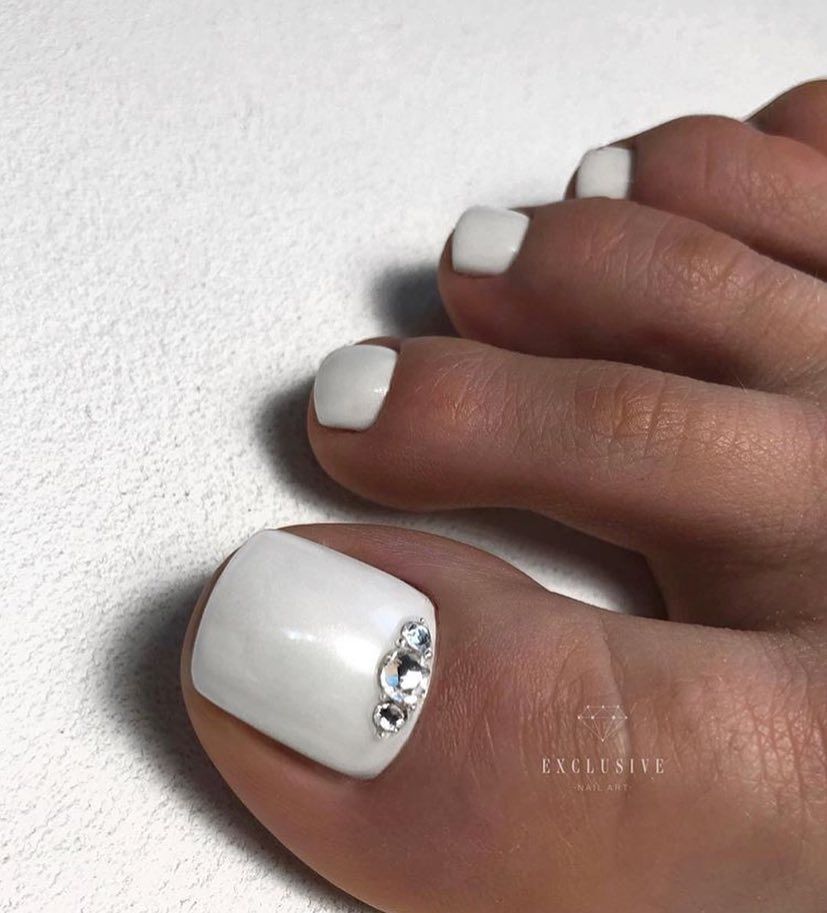 Sans aucun doute, le pédicure blanc est très beau, mais si vous l’ajoutez avec des strass brillants, l’aspect des jambes changera de manière significative. Les strass sont en mesure de mettre l'accent sur le toilettage et l'attractivité. Les strass sont principalement utilisés au niveau de la cuticule, et même un léger motif peut être créé sur un gros clou. L'essentiel est qu'il n'y ait pas trop de décor sur les ongles, sinon l'aspect délicat de la pédicure se transformera en un design accrocheur et rugueux.