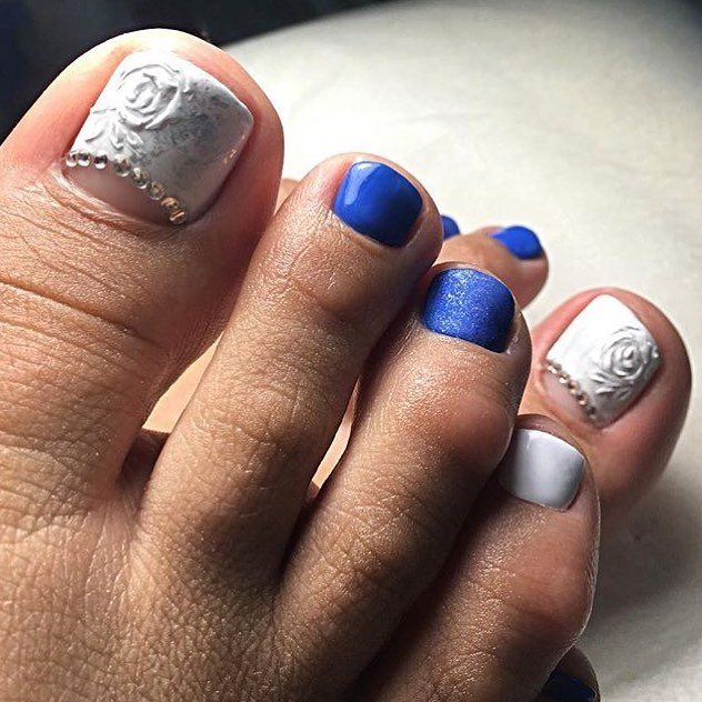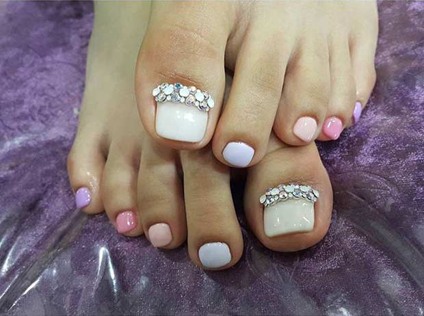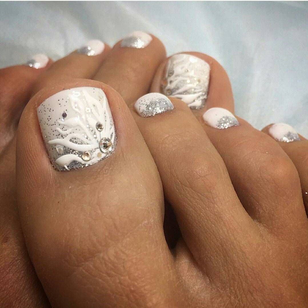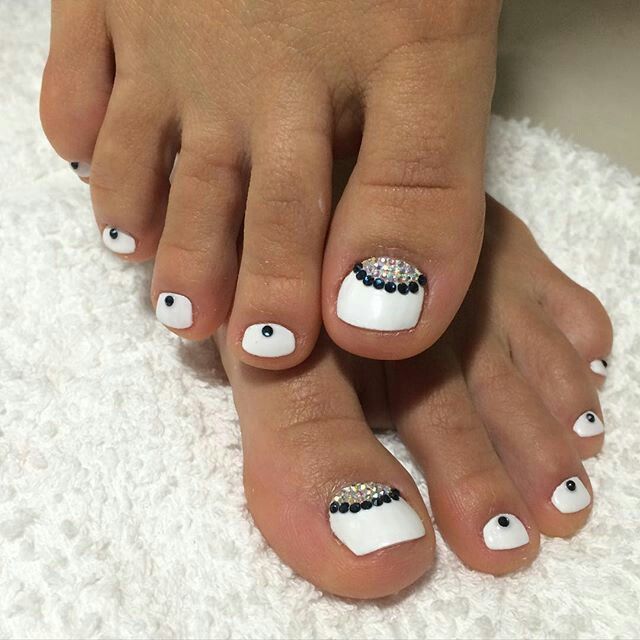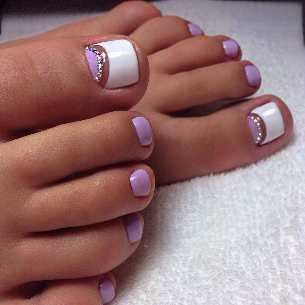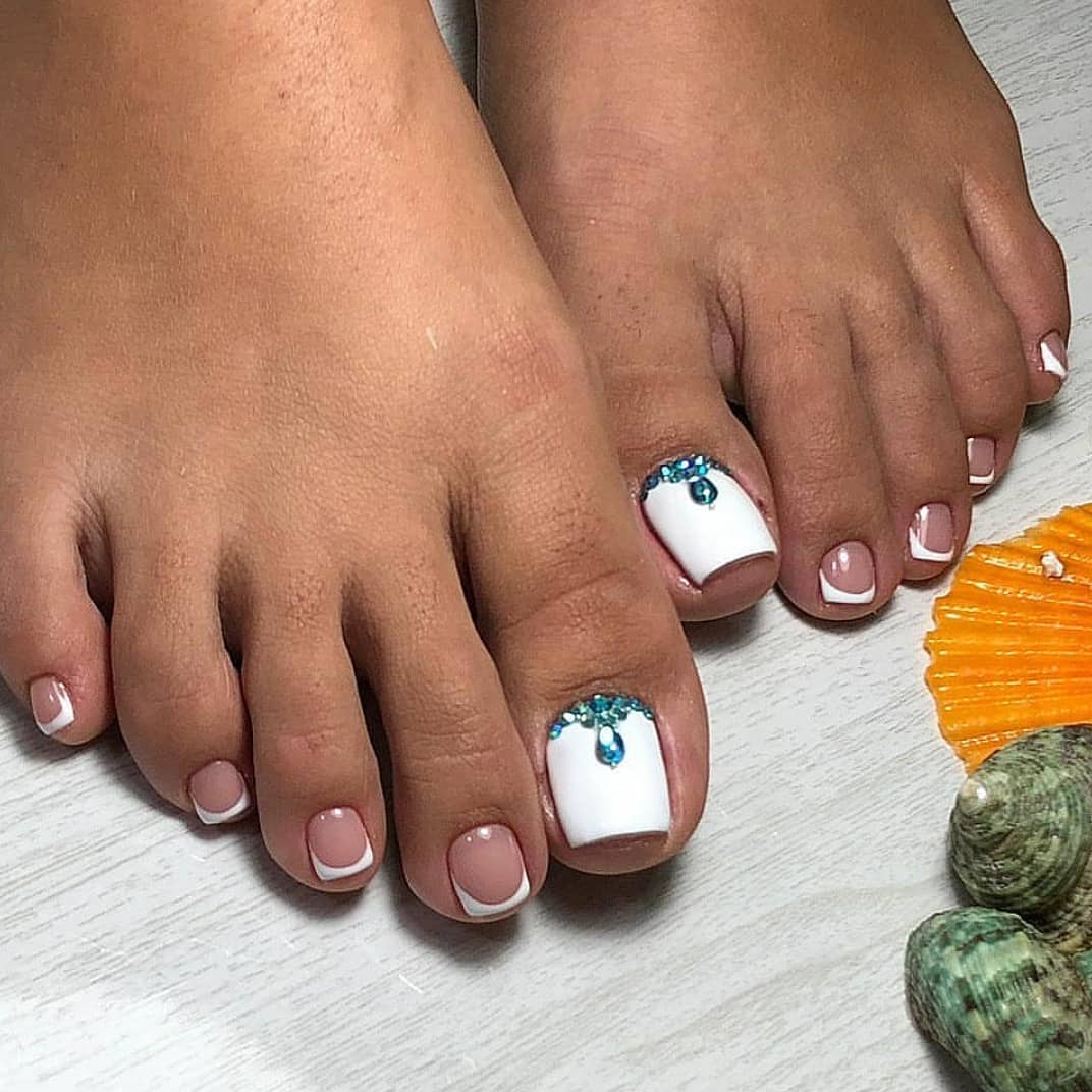 Sans aucun doute, le pédicure blanc est très beau, mais si vous l’ajoutez avec des strass brillants, l’aspect des jambes changera de manière significative. Les strass sont en mesure de mettre l'accent sur le toilettage et l'attractivité. Les strass sont principalement utilisés au niveau de la cuticule, et même un léger motif peut être créé sur un gros clou. L'essentiel est qu'il n'y ait pas trop de décor sur les ongles, sinon l'aspect délicat de la pédicure se transformera en un design accrocheur et rugueux.