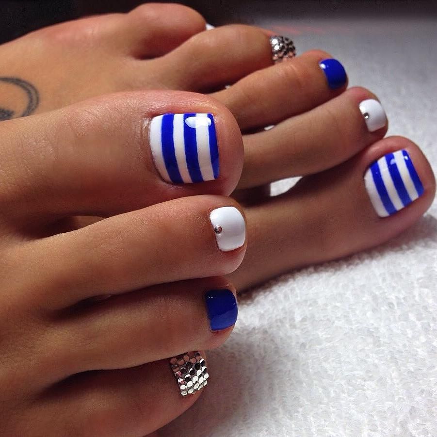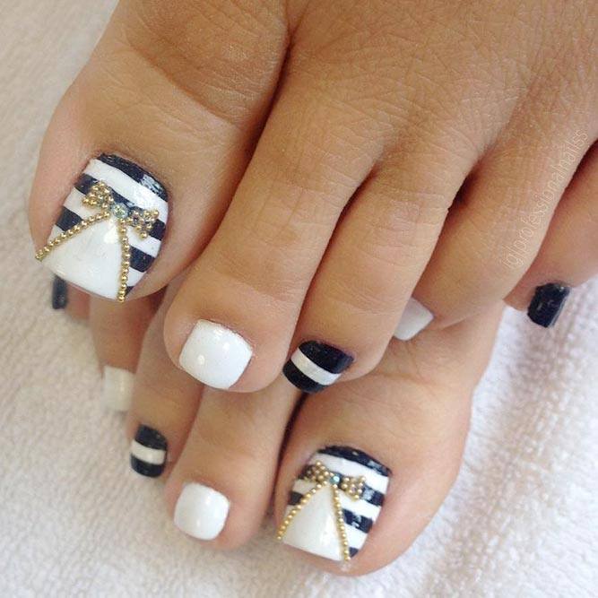 Les motifs géométriques sont un excellent moyen de compléter une pédicure blanche. Cette conception est sophistiquée pour les filles qui préfèrent le style militaire. Des lignes lisses sur un fond blanc peuvent être réalisées en différentes couleurs. Les plus pertinents d'entre eux: noir, or, argent, marron, vert foncé et bordeaux. Une telle pédicure est très belle et inhabituelle. Effectuer des motifs géométriques sur un ou plusieurs ongles. Des strass brillants peuvent être ajoutés à volonté.