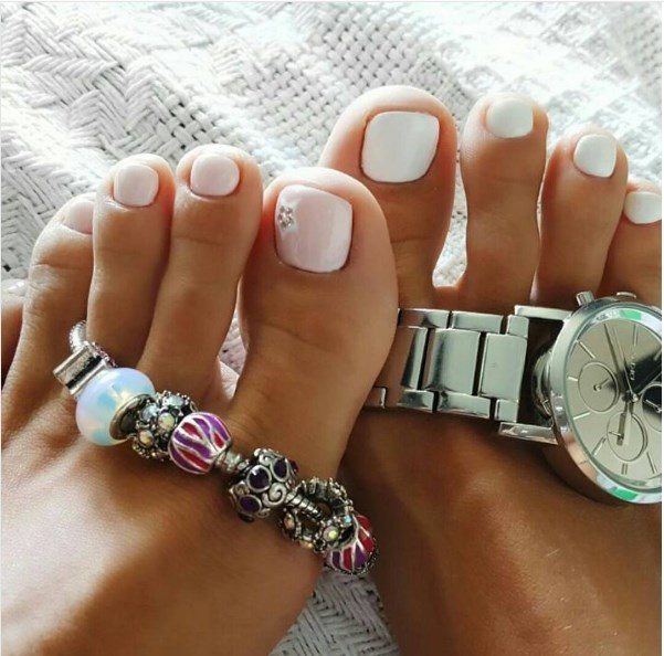 Cette année, le blanc domine le reste des tons. Mais il convient de noter que pour une pédicure, vous pouvez choisir le lait, le rose pâle, le gris clair ou simplement une couleur classique blanche. Très souvent, cette couleur est utilisée comme élément d'accent. Ils couvrent le plus souvent le pouce. La couleur universelle se combine très bien avec tous les autres tons, ce qui explique sa popularité incroyable. Cette année, l'utilisation de divers décors a gagné en popularité. Et avec quels tons et éléments de décoration exactement pour combiner une belle pédicure blanche, nous dirons plus loin.