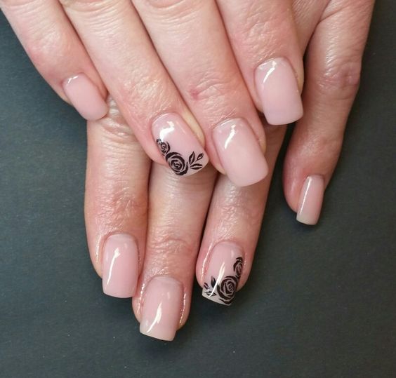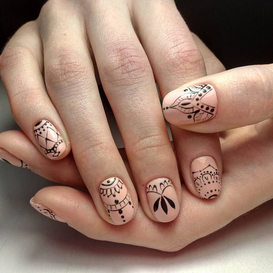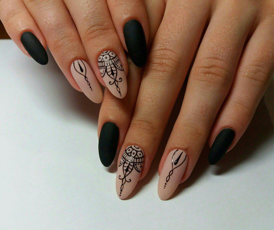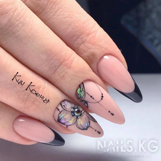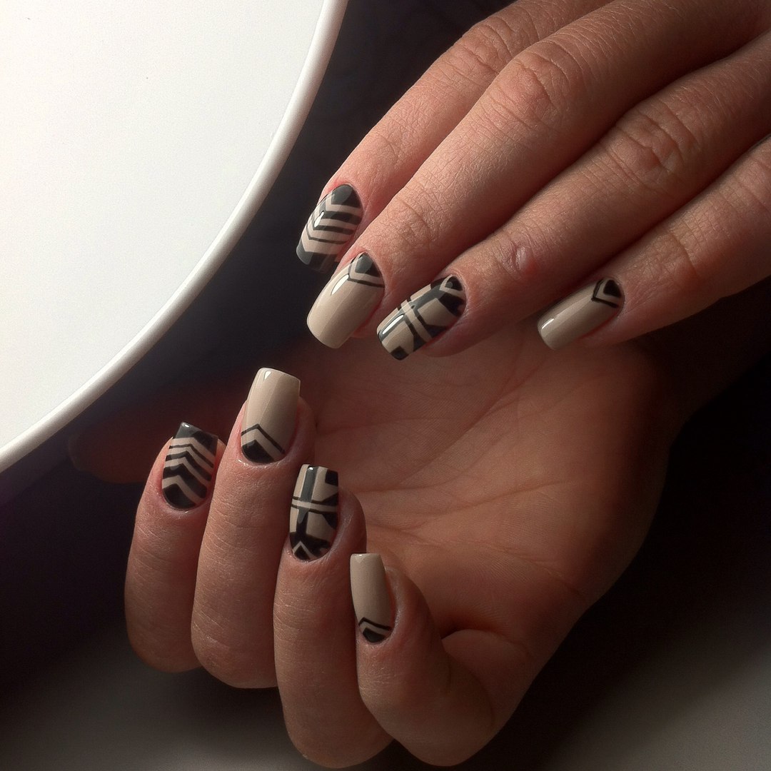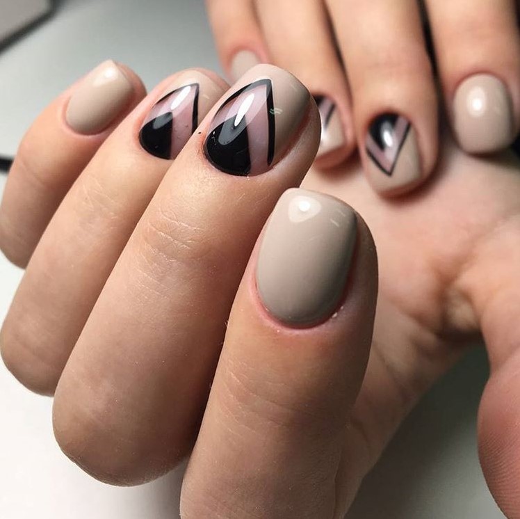 La manucure beige avec adjonction de vernis noir se marie bien avec la technique française lorsque la couleur blanche de la bande sur le bout de l’ongle est remplacée par du noir. À l’aide d’une teinte noire, vous pouvez représenter un dessin ajouré d’un bas ou d’une empreinte d’animal, qui est actuellement très populaire.