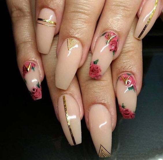 La manucure beige et or est une excellente solution lorsque vous voulez autre chose qu'un classique. Cette option a l'air fraîche et originale. Vous pouvez recouvrir les pointes d'or, dessiner une variété de formes géométriques, faire une sélection sous la forme d'un trou ou appliquer une impression léopard.
