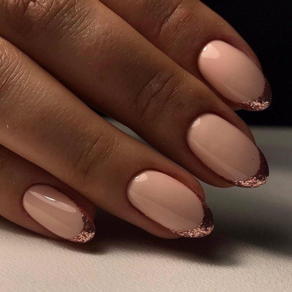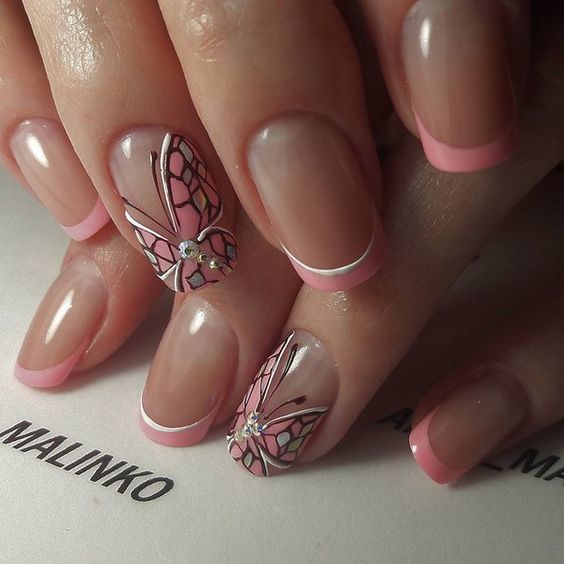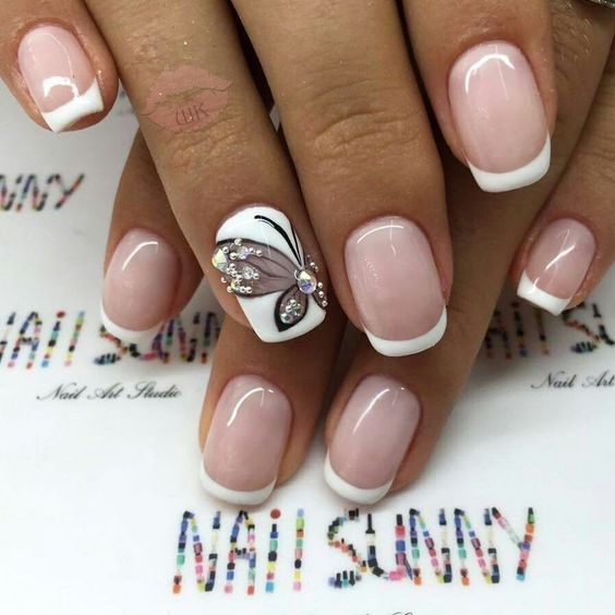 Souvent, un ton beige est utilisé pour représenter la manucure française. Cette option polyvalente s’intégrera parfaitement dans vos images de tous les jours et pour la publication. Pour certains, une manucure française de couleur beige peut sembler ennuyeuse et ordinaire. Dans ce cas, vous pouvez le diluer avec un décor.