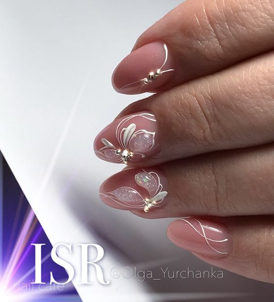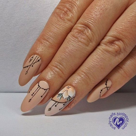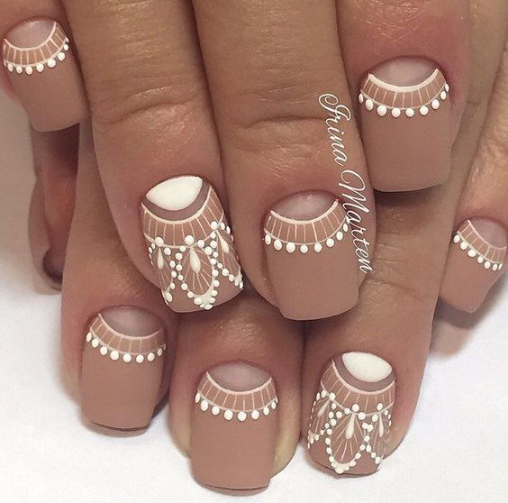 Manucure beige avec des éléments blancs.
