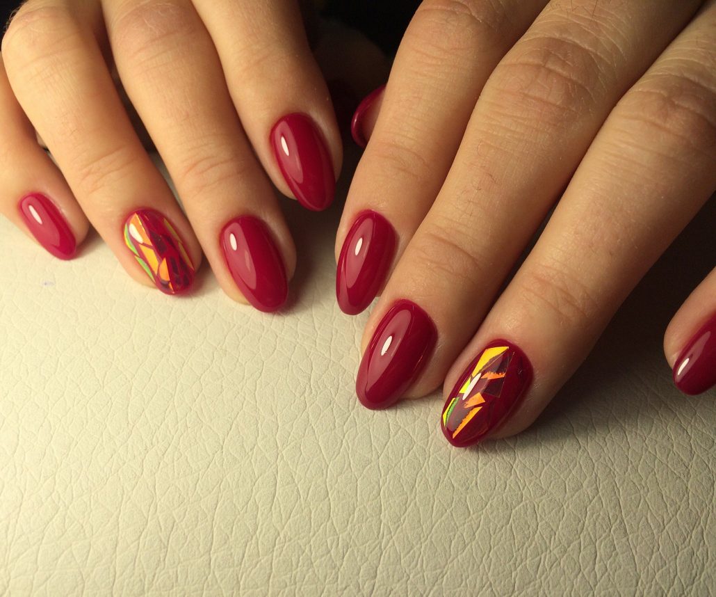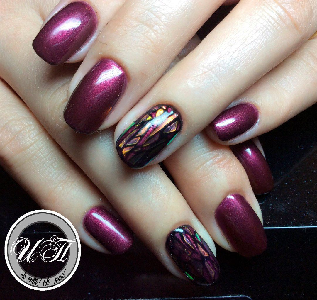 En plus des cailloux, la manucure bordeaux peut être décorée avec des morceaux de papier d'aluminium. Quelle que soit la teinte dorée ou argentée que vous choisissez, vous obtiendrez une dispersion spectaculaire de fragments de verre sur les ongles bordeaux.