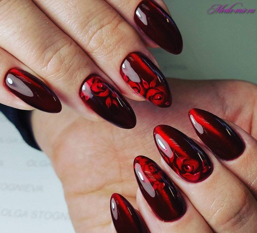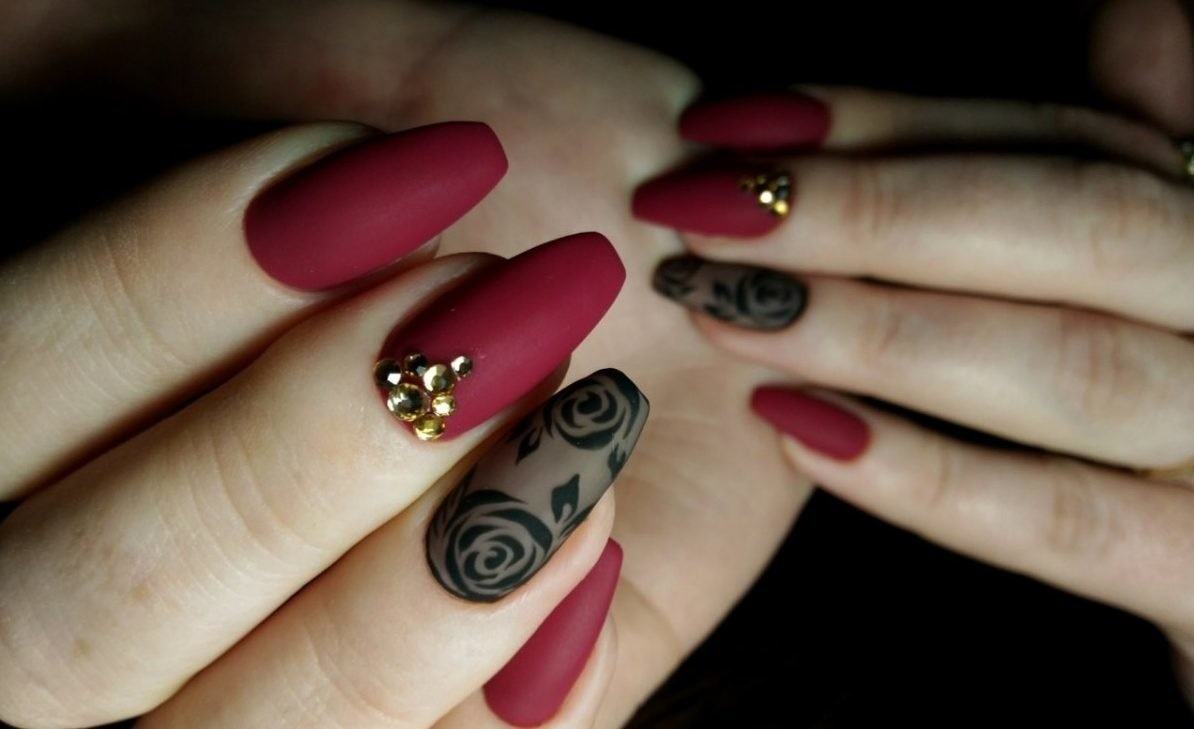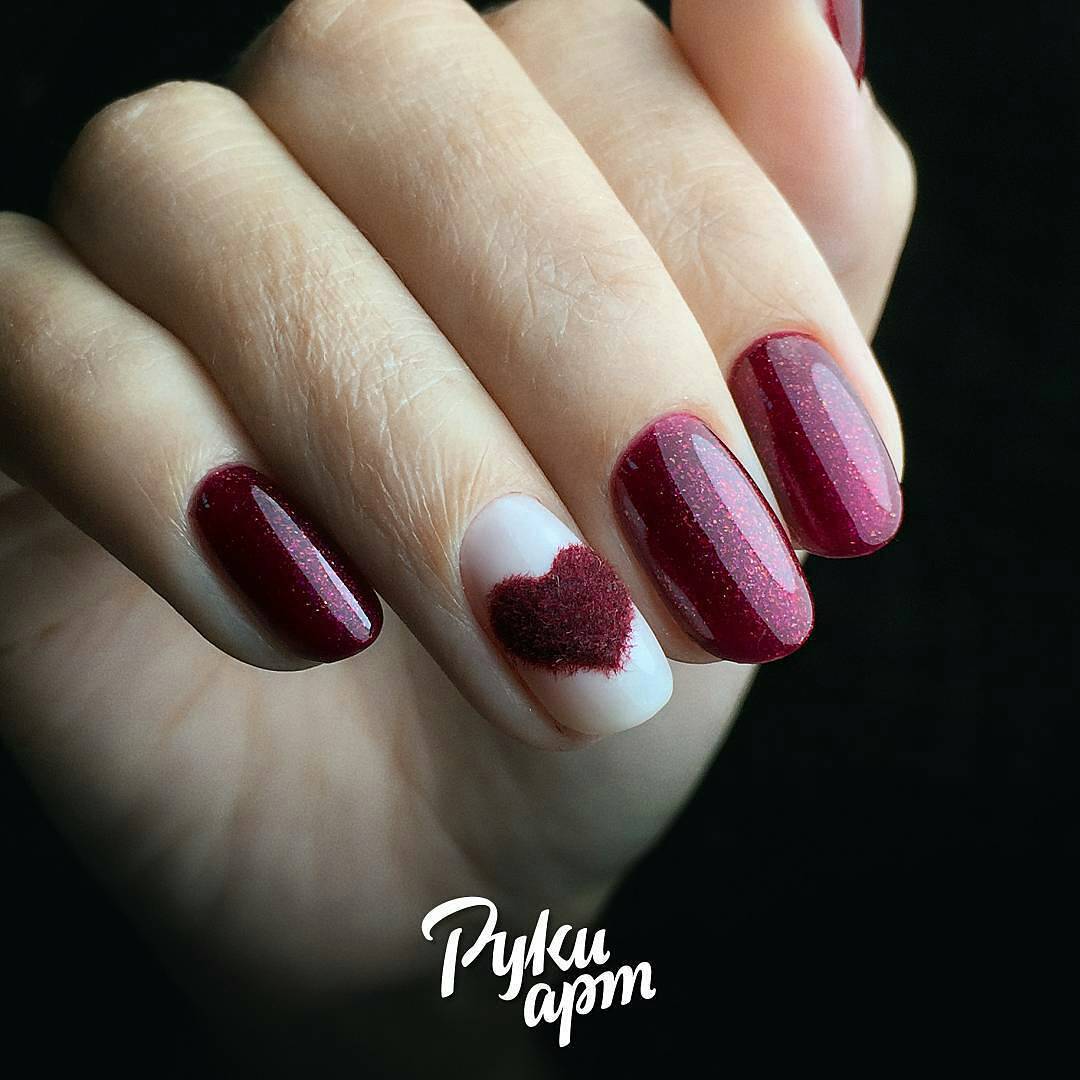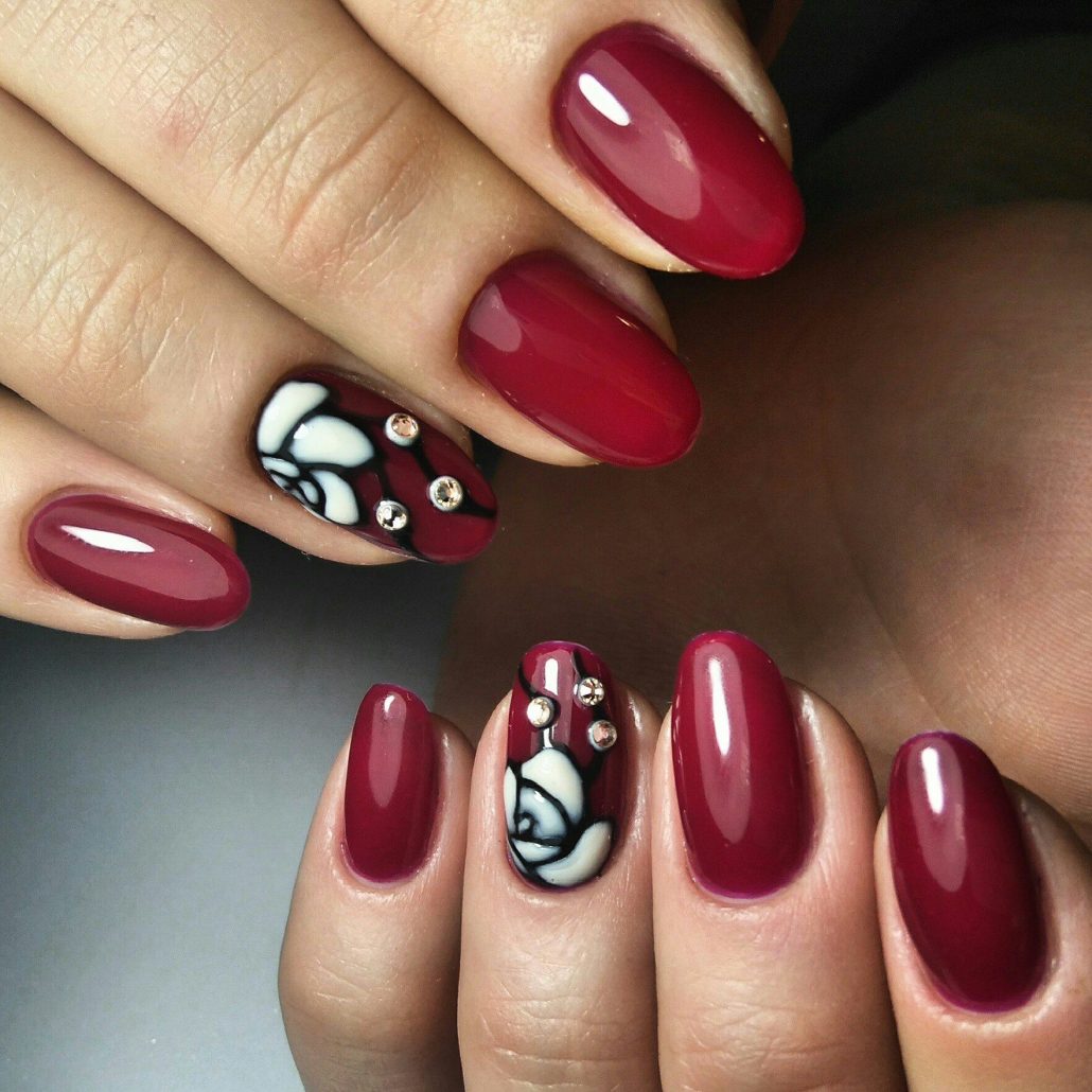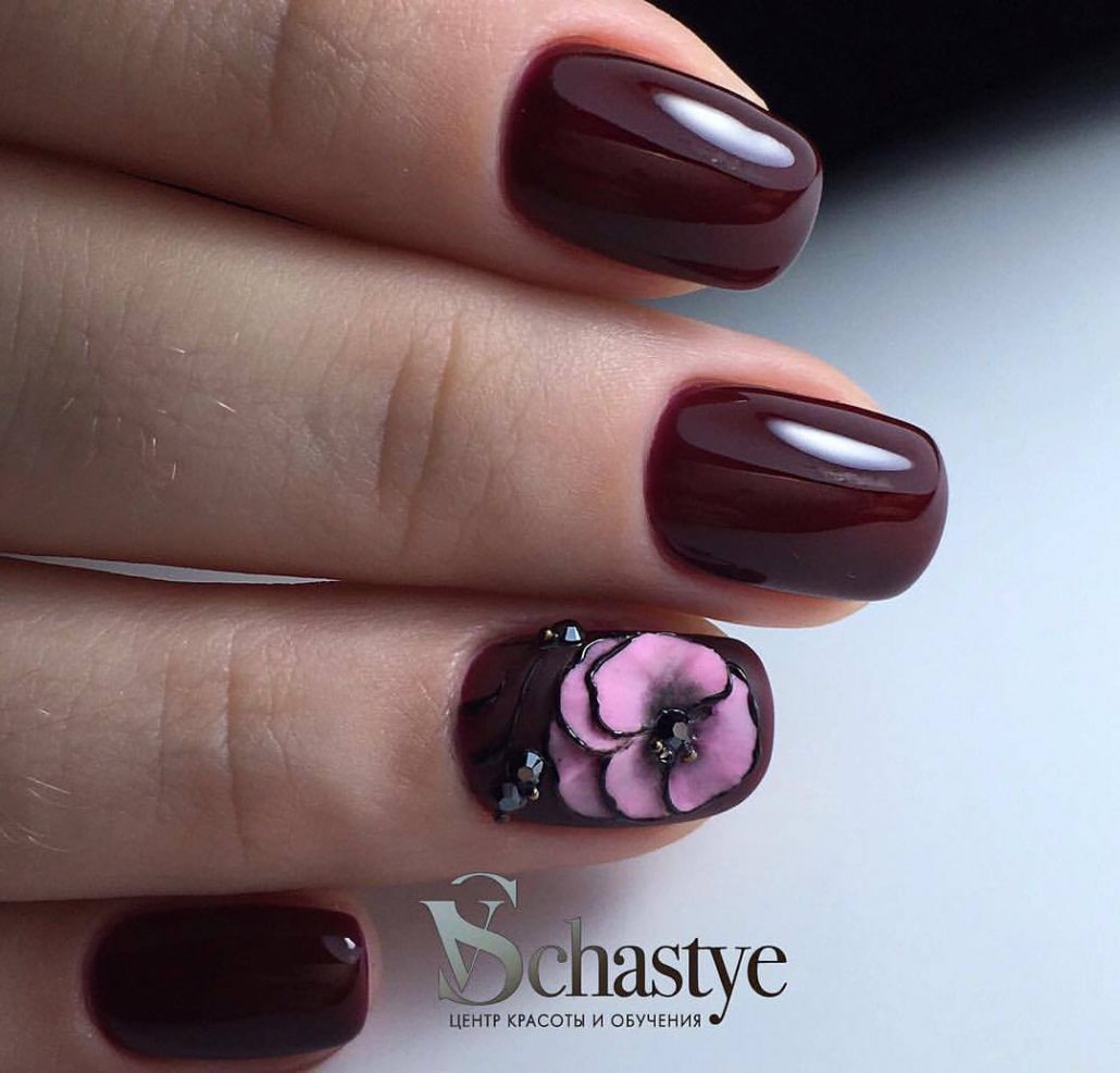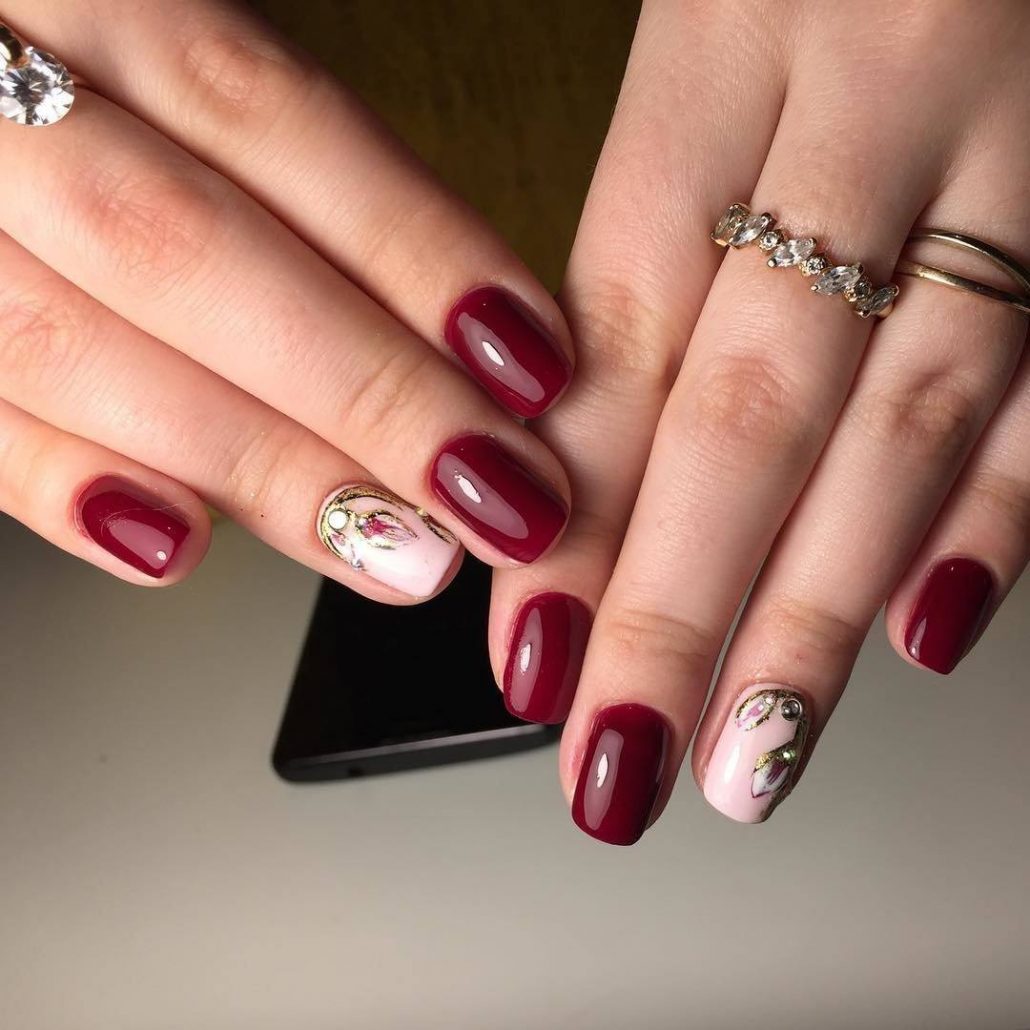Une manucure avec des cerises peintes sera pertinente en été. Les jouets de Noël peuvent décorer la manucure du nouvel an. Le cœur bordeaux dessiné sera pertinent pour la Saint-Valentin. Un site Web dessiné sur un fond bordeaux vous permettra de devenir la vedette d’une soirée à thème dédiée à Halloween.