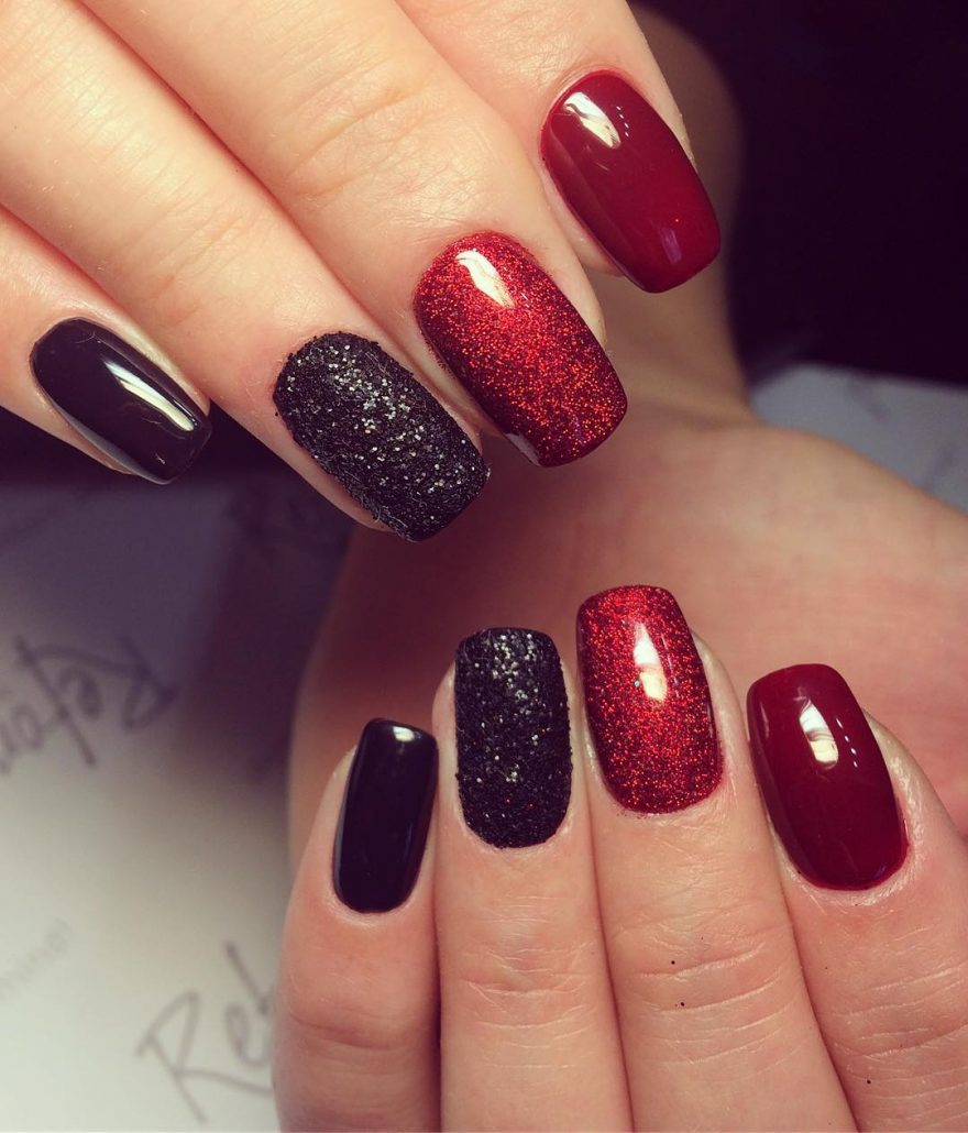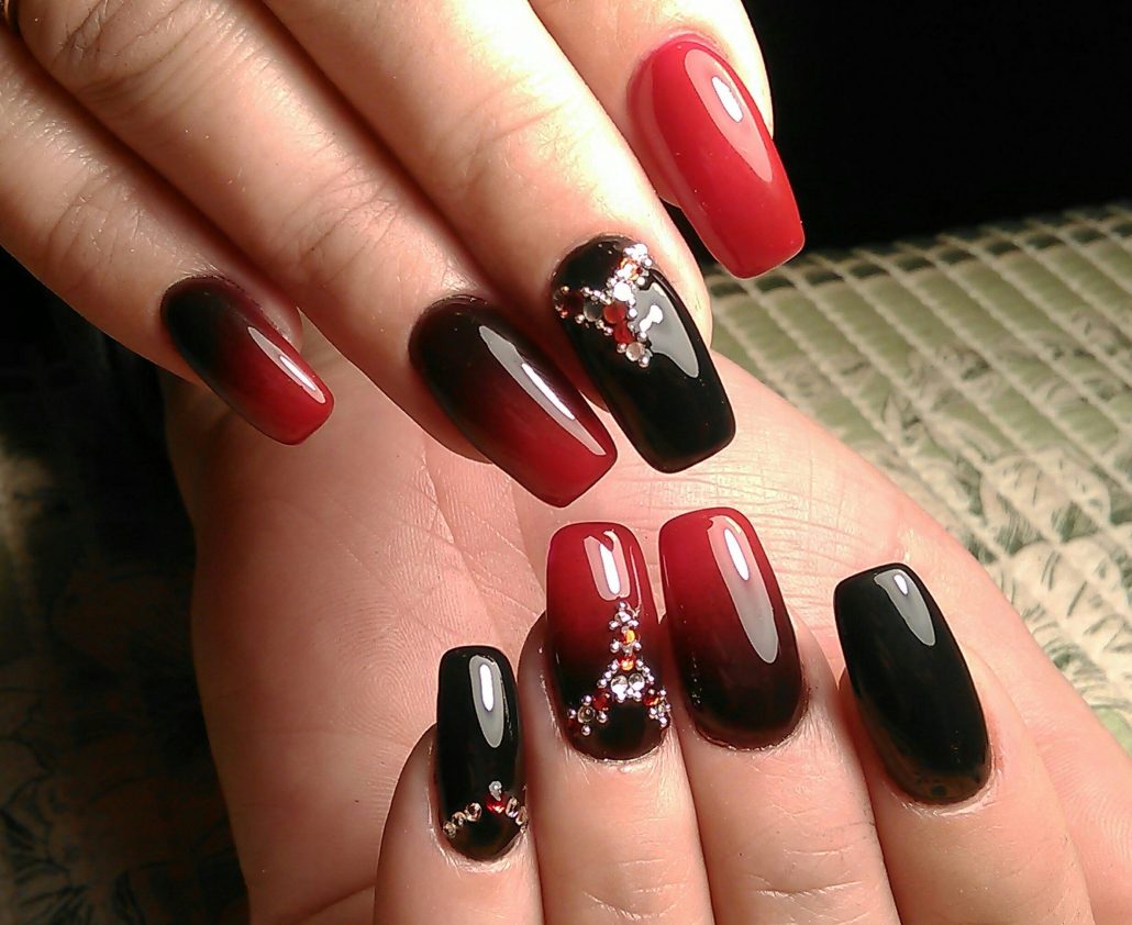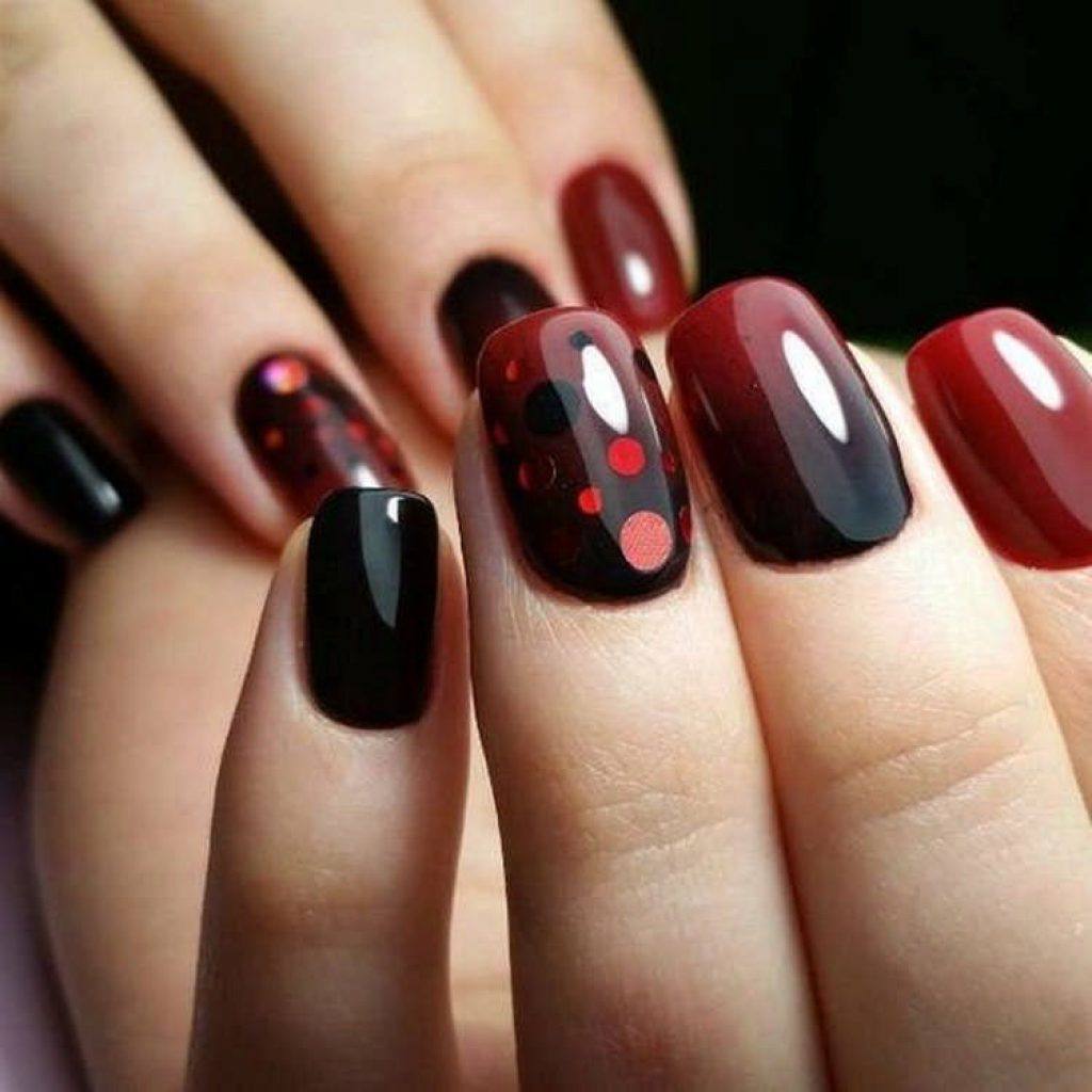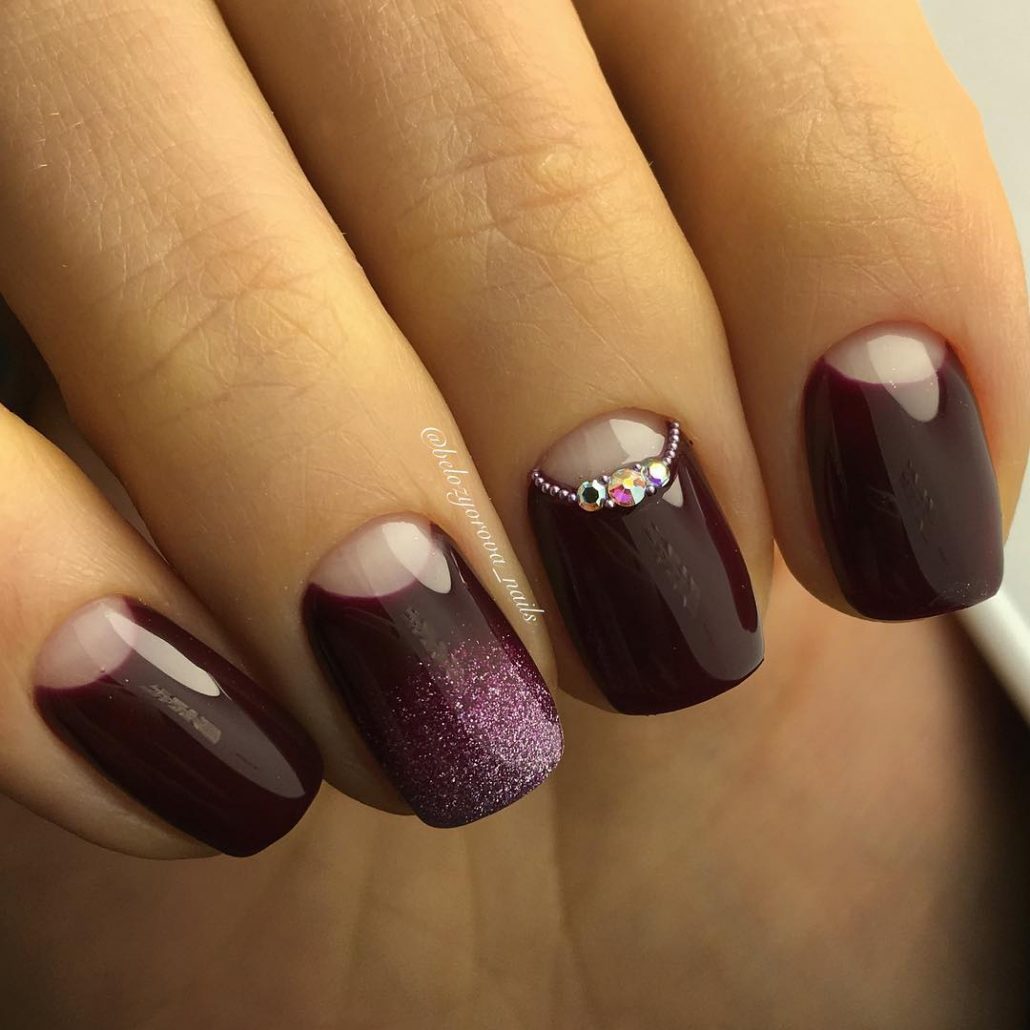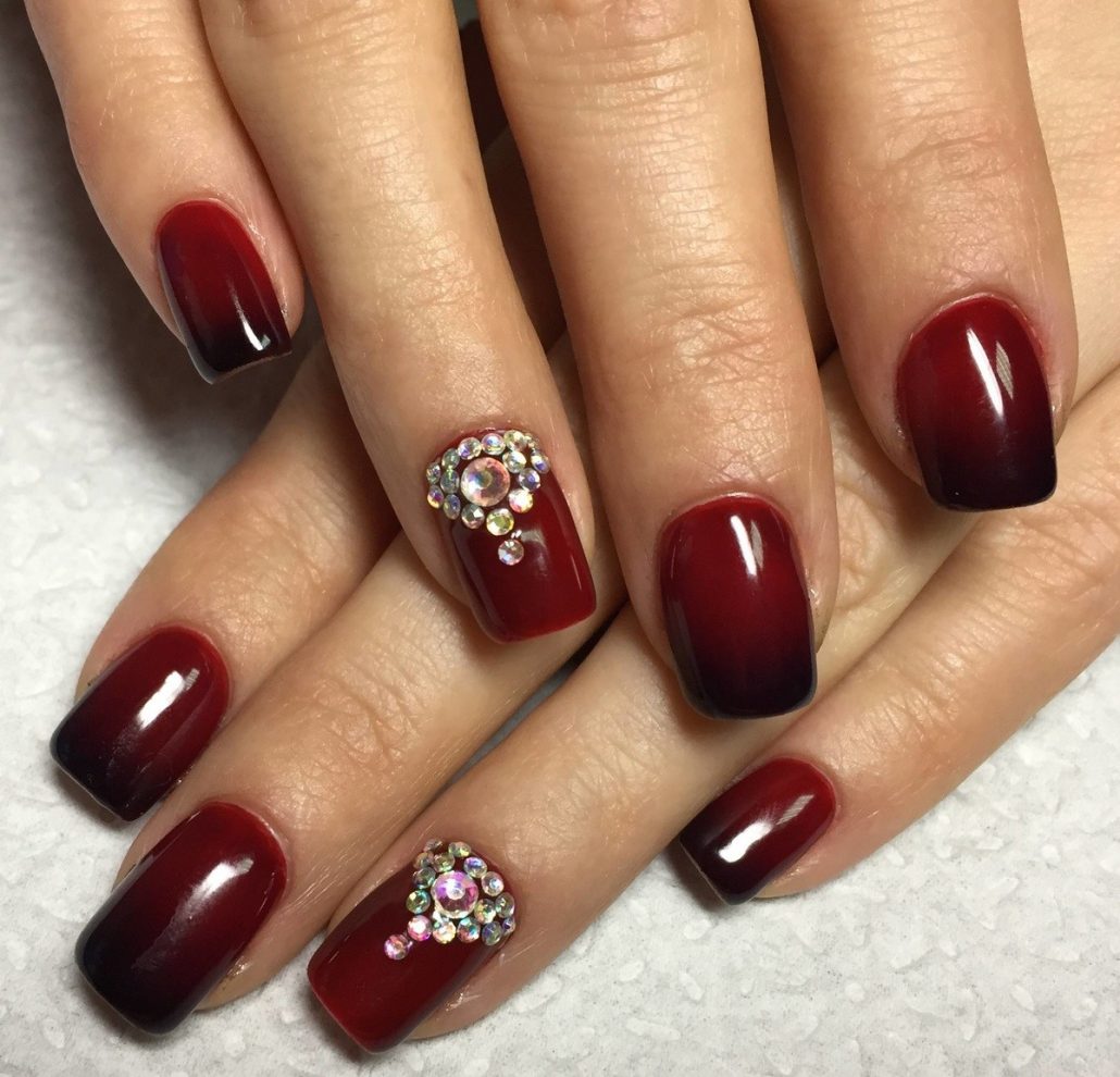 La technique de manucure en dégradé est très intéressante et vous permet de créer des images époustouflantes. Il est préférable d'utiliser du bourgogne en combinaison avec du vernis noir. Ceux qui trouvent cette combinaison trop sombre peuvent les appliquer sur une couche de finition rouge ou autre. Les étincelles et les strass contribueront à ajouter du mystère et de l'éclat à un tel design.