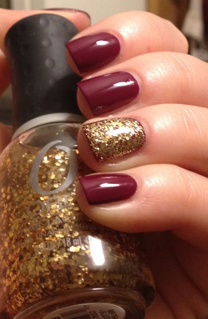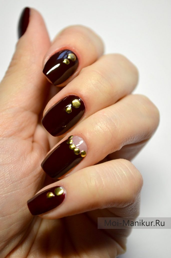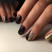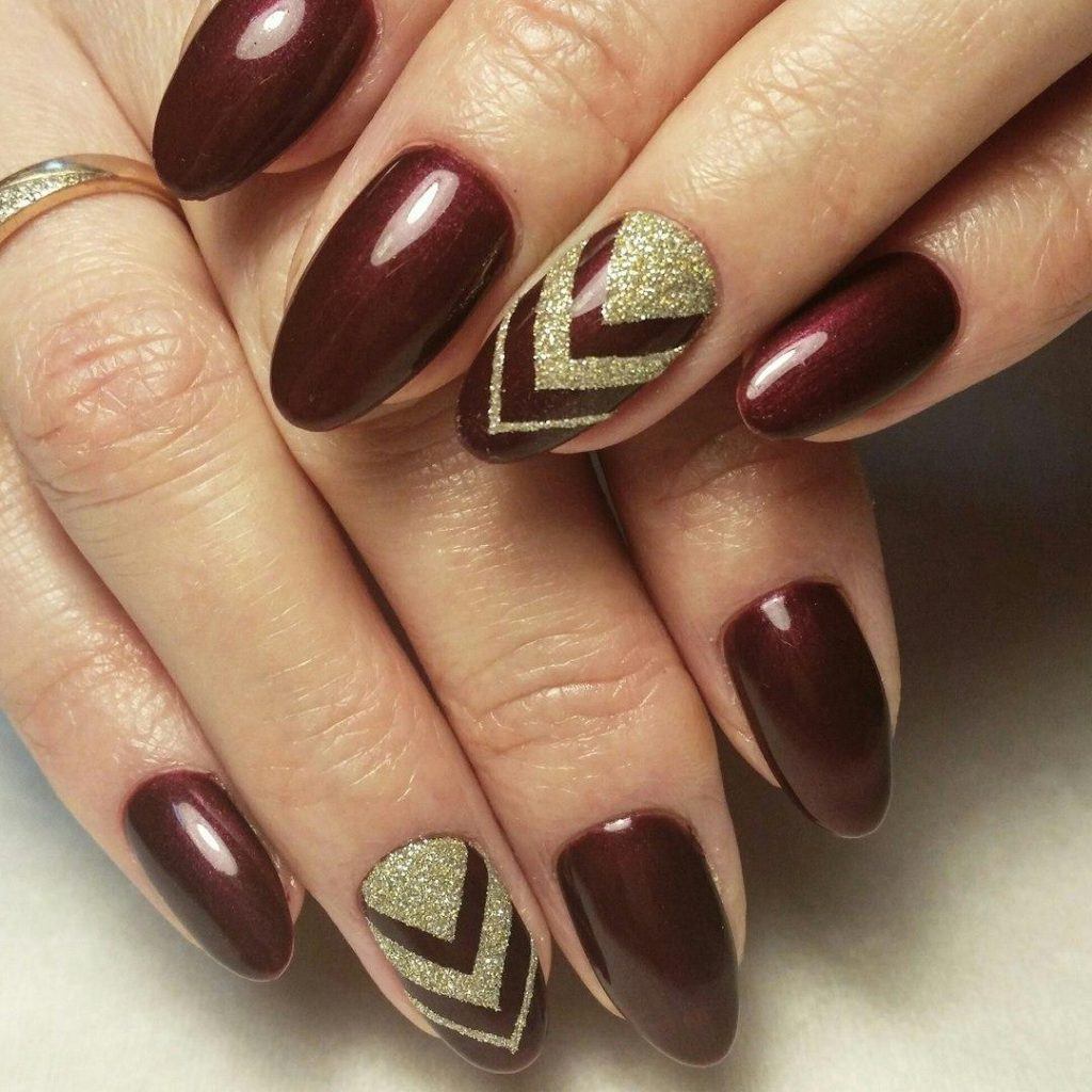 L'association du bordeaux avec de l'argent ou de l'or est idéale pour un look de soirée. Quelle que soit la longueur de l'ongle, la manucure sera élégante et luxueuse. Les options de combinaison peuvent être nombreuses. Il peut s'agir d'un vernis doré sur l'annulaire, tandis que tout le reste sera bordeaux. Golden peut décorer la pointe du souci Bourgogne. Il est également possible de dessiner des dessins sur un fond bordeaux en or.