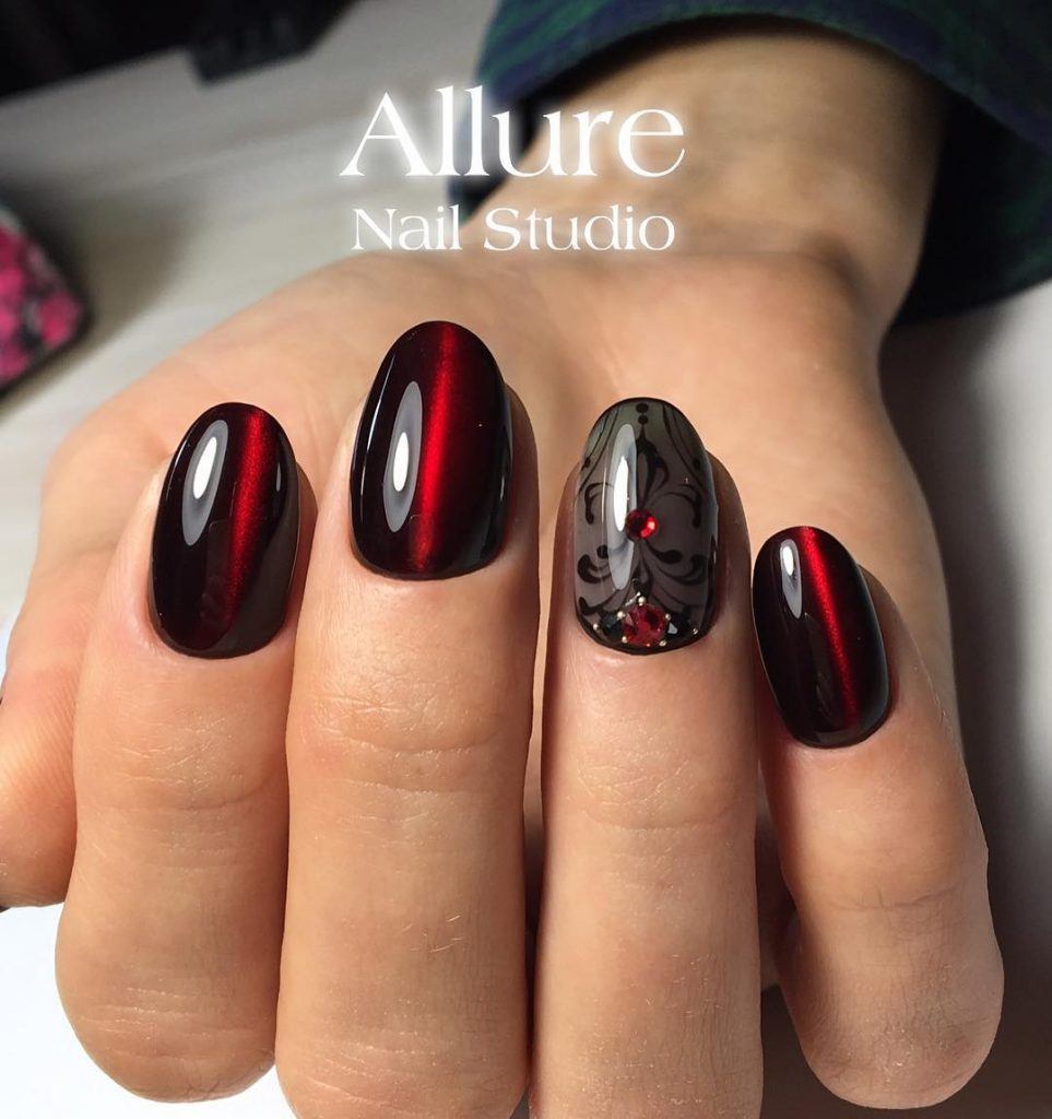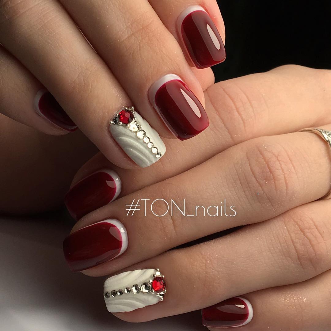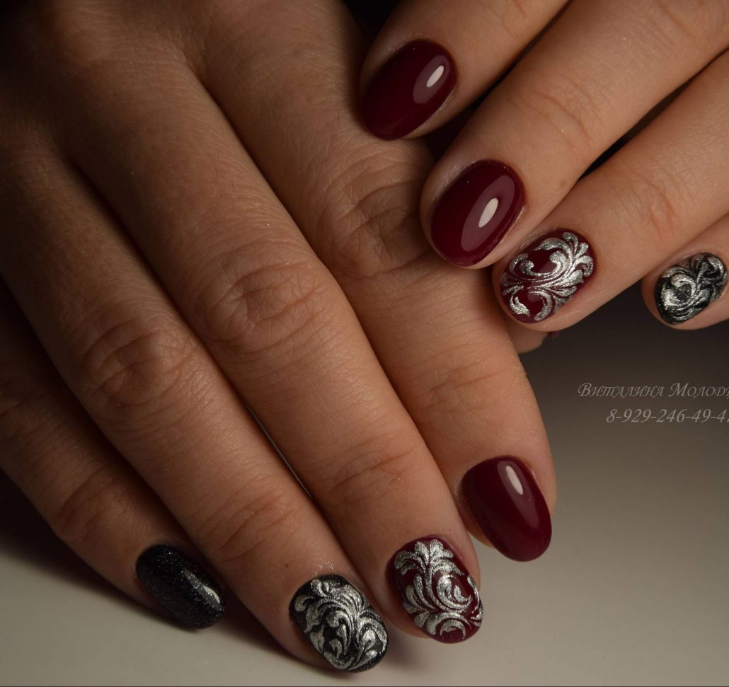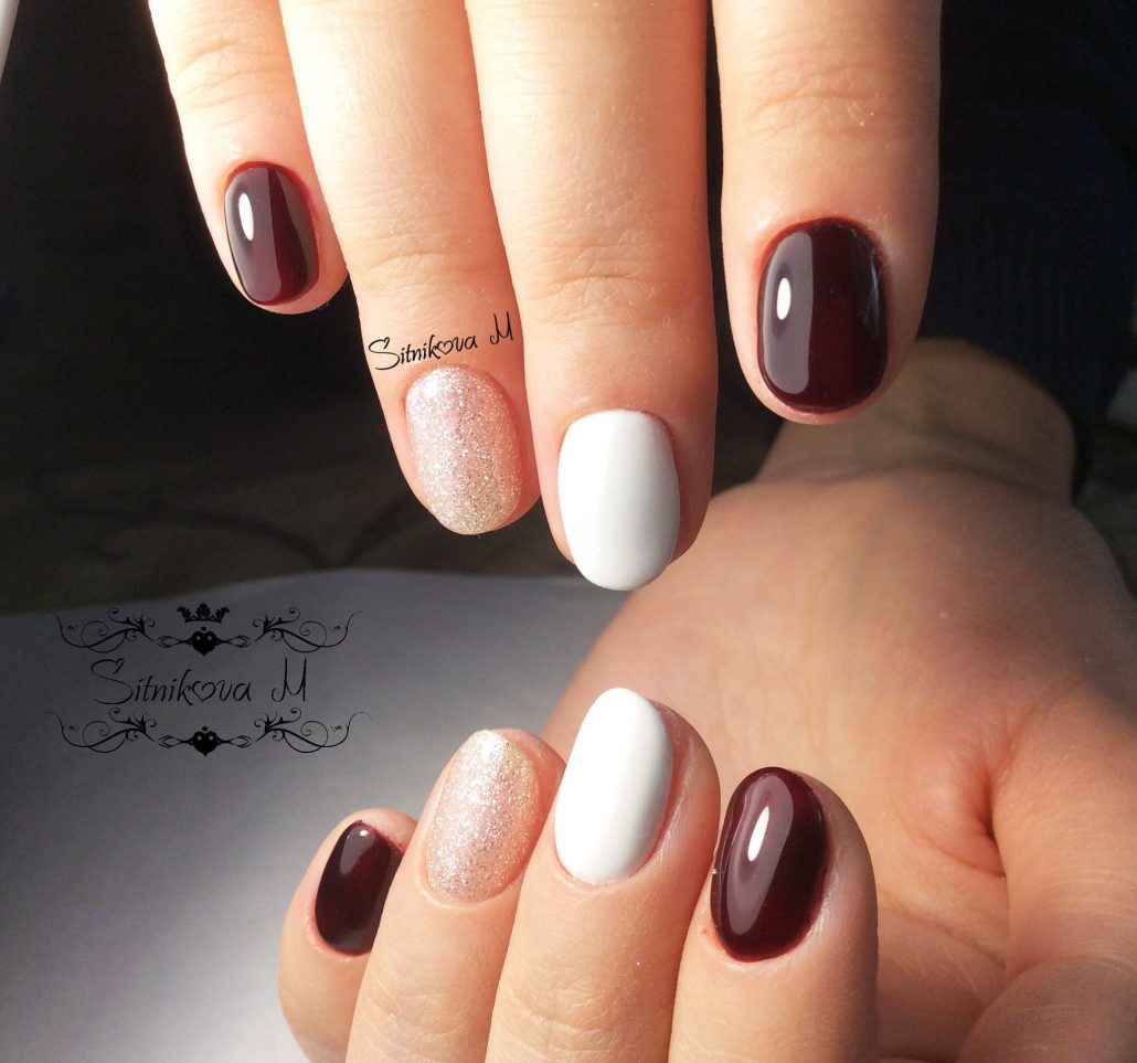 Différentes nuances peuvent compléter la saturation du bordeaux. Tout d’abord, c’est le classique noir, blanc et or. Vous pouvez décorer une manucure bordeaux avec un frottis, une poudre ou une feuille.
