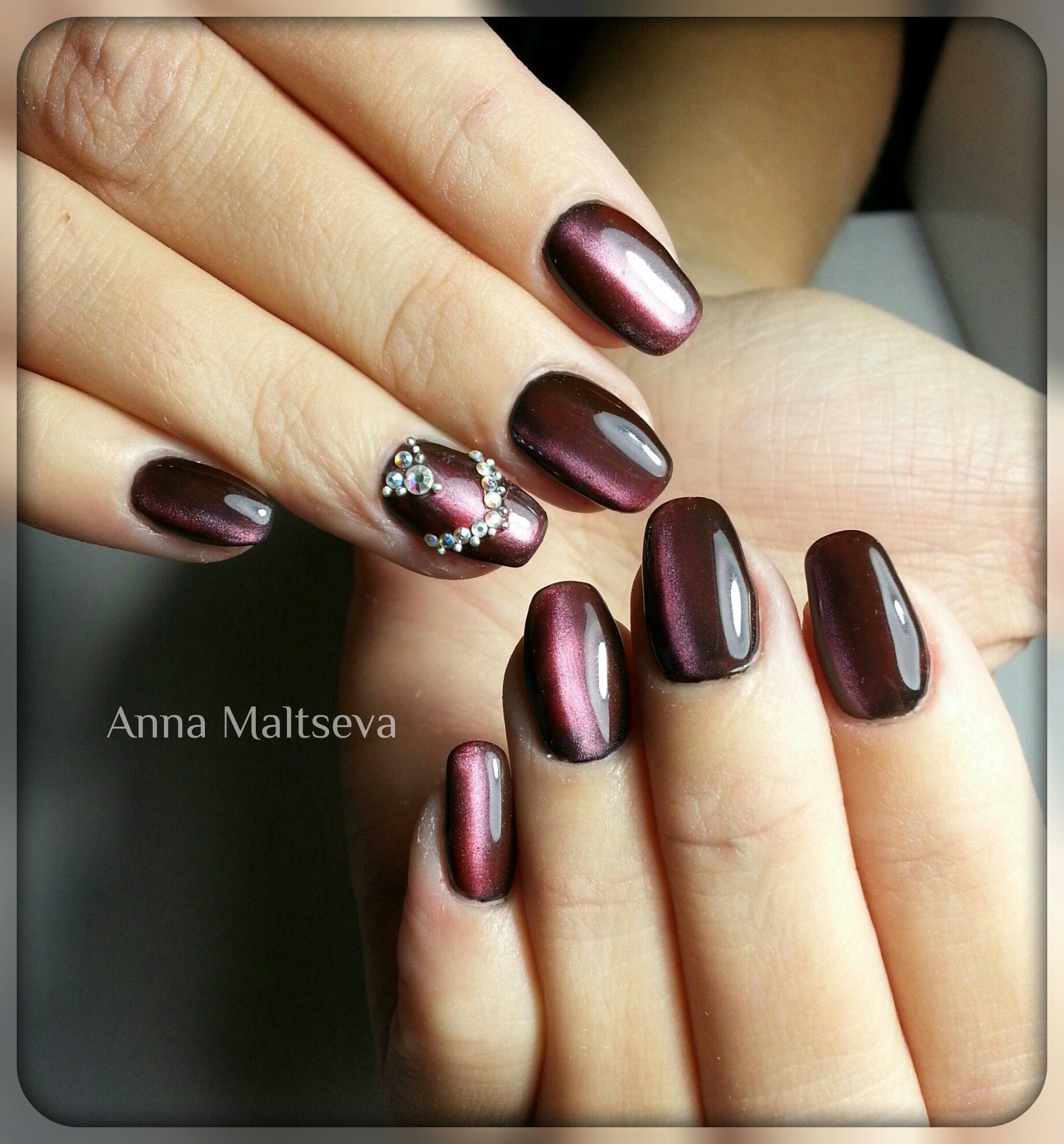 Ceux qui aiment être toujours à l'honneur remarqueront le spectaculaire motif œil de chat sur fond bourgogne. Une telle manucure en elle-même est très autonome et ne nécessite donc pas de décoration supplémentaire.