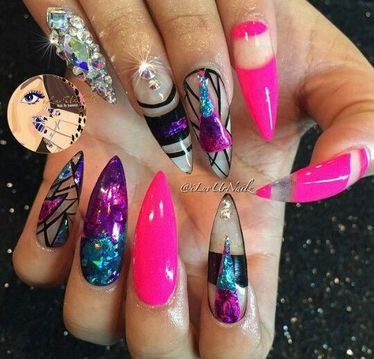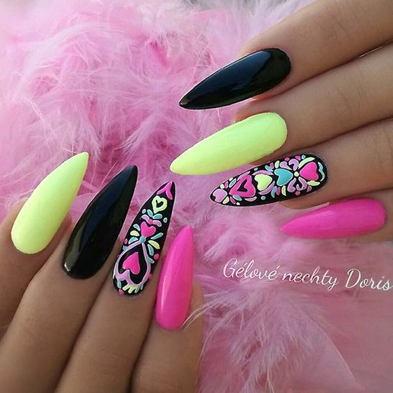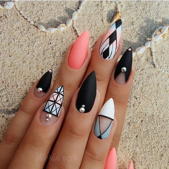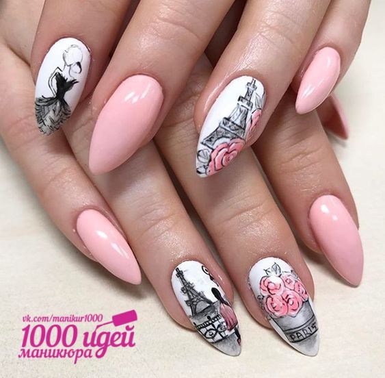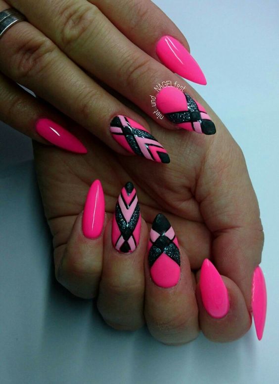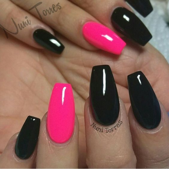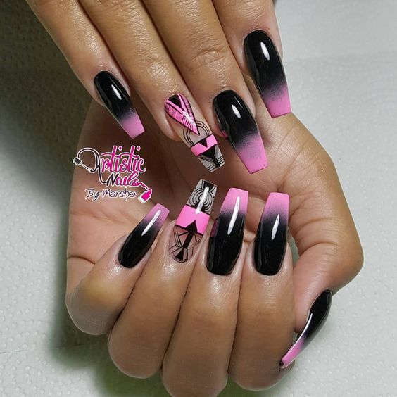 Ongles longs - c’est une excellente "plate-forme" pour effectuer divers dessins. Par exemple: géométrie, ombre ou veste. Pendant longtemps, les gens ont cru que les ongles longs recouverts d'une couleur accrocheuse étaient artificiels et trop vulgaires. Mais, malgré cela, une telle conception de clou est maintenant à la mode. Faire des ongles longs dans la manucure noire et rose, vous pouvez souligner la belle forme des ongles, la nature indépendante de leur propriétaire. Il convient de rappeler que, bien que le noir soit considéré comme universel, il peut ne pas convenir sur les formulaires longs au bureau ou au quotidien.