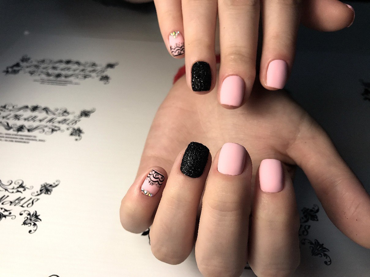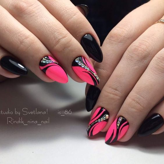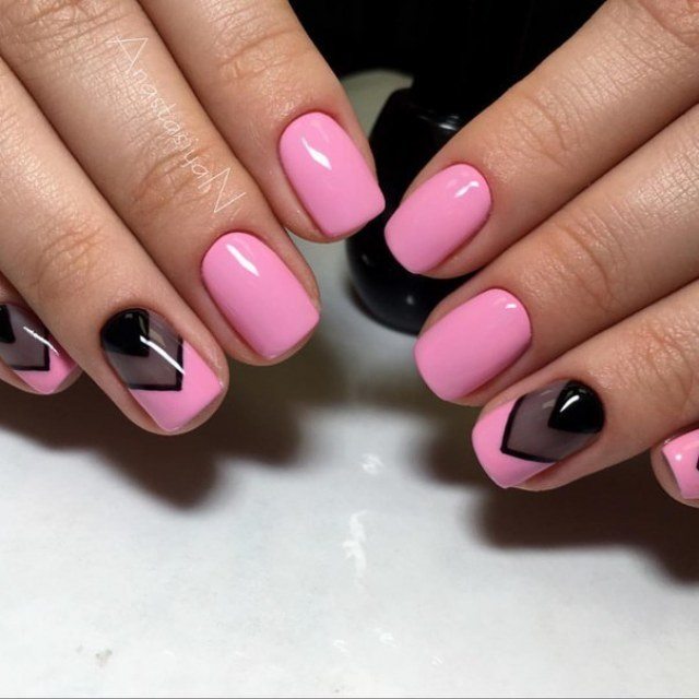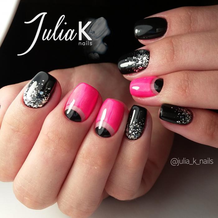 La manucure noire et rose est une solution brillante et inhabituelle pour la conception des ongles. Ces couleurs conviennent à toute occasion. Ils s'intègrent parfaitement au style de tous les jours et, après quelques ajouts, ils peuvent devenir le clou d'un look de soirée ou de vacances. La combinaison du noir et du rose peut être réalisée dans une grande variété de techniques. Cette combinaison de nuances peut ajouter un peu de charme. Si vous souhaitez mettre l’accent sur vous, vous pouvez ajouter un décor sous la forme de sable, d’étincelles ou de strass. Cet ajout rendra un style strict plus vivant et spectaculaire.