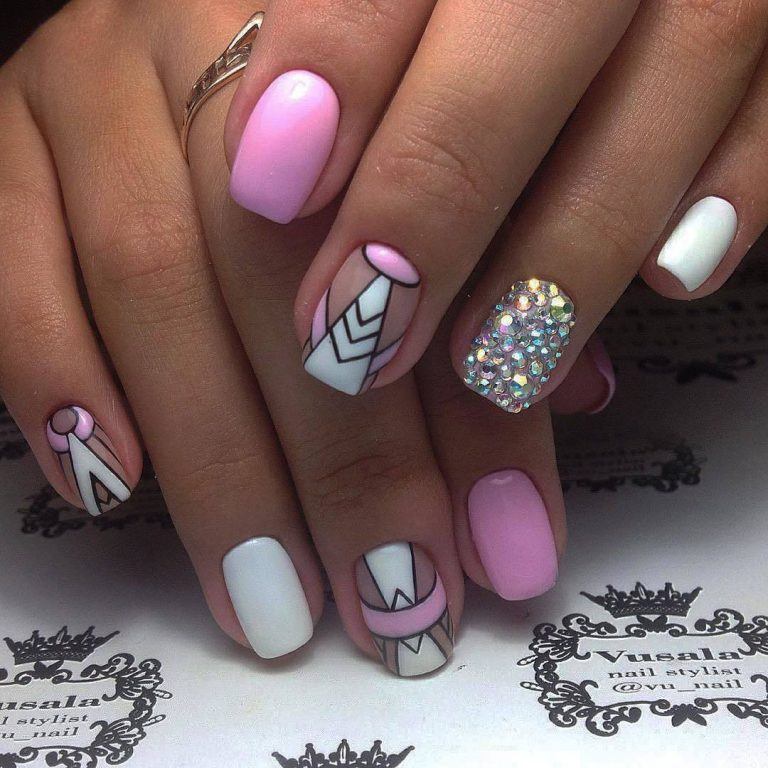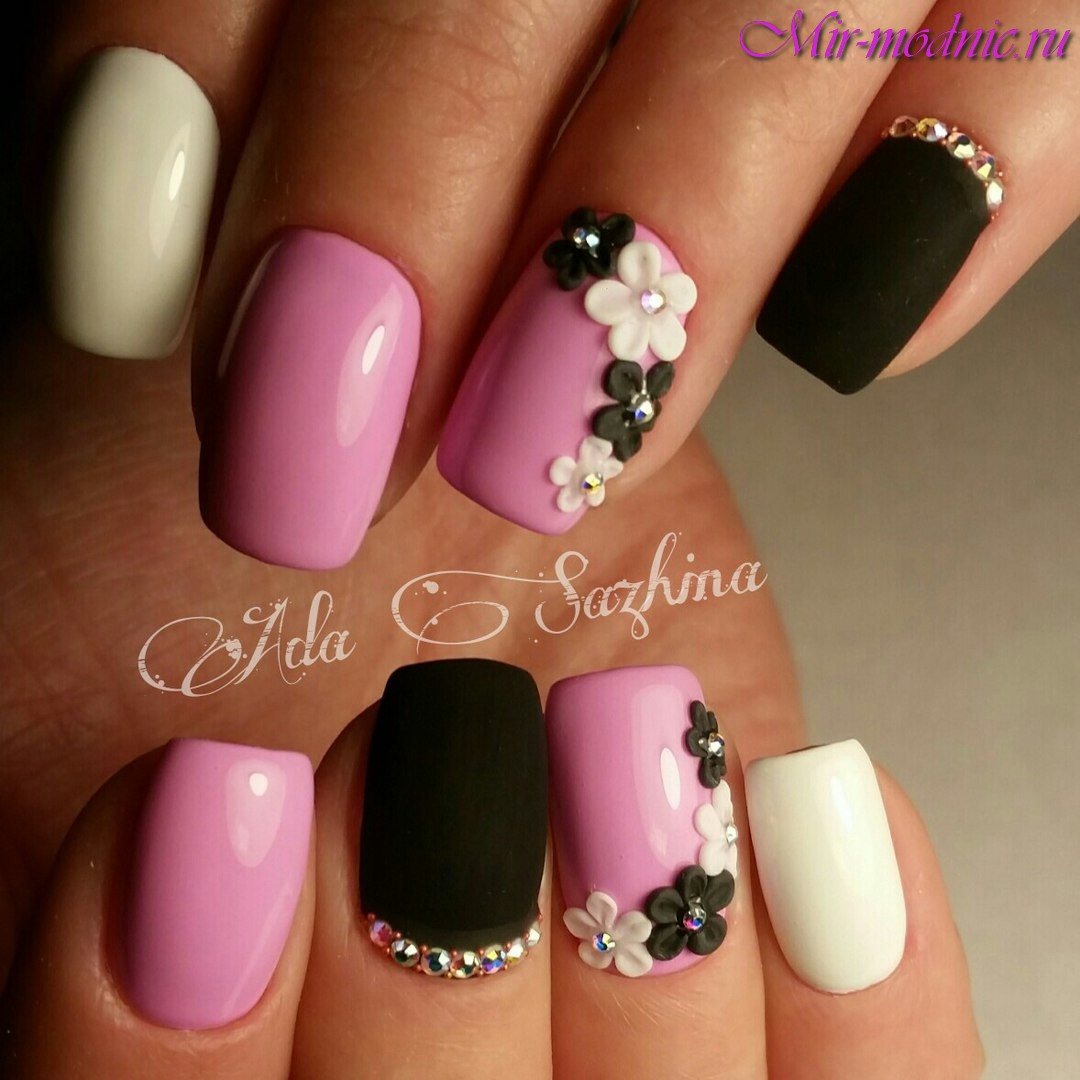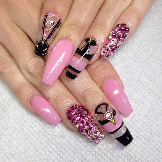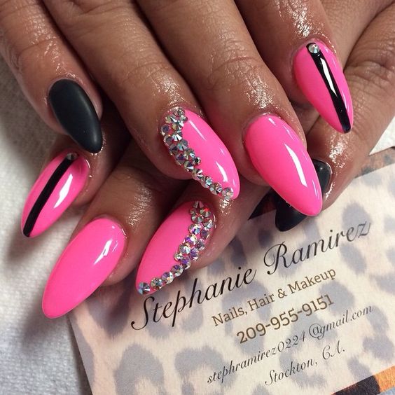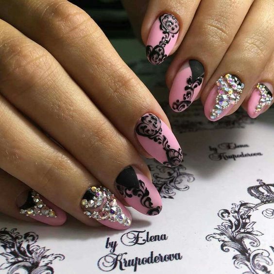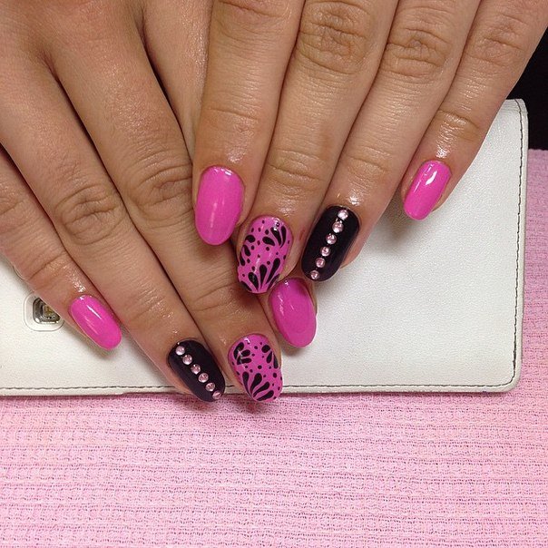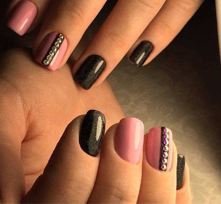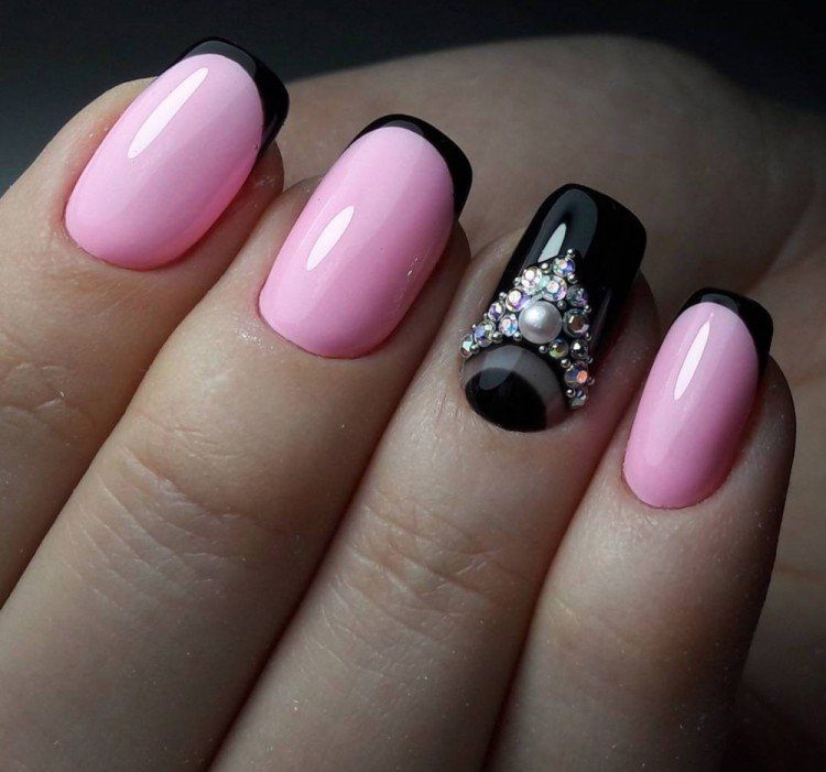 Une manucure, qui est faite dans des couleurs noires et roses en combinaison avec des strass, aura l’air très agréable et luxueux. Beaucoup pensent que les strass sont provocants. Si vous ne voulez pas d'une manucure audacieuse, il vous suffit de connaître le sens des proportions. Vous pouvez recouvrir l'ongle de vernis noir en le complétant avec des strass roses simples, ou bien faire l'inverse. Vous pouvez disposer d'un ornement léger. Par exemple, diagonale, brisée, horizontale ou verticale. Si vous faites une manucure de lune noire et rose, française, demi-lune, vous pouvez étendre les strass le long du trou sur plusieurs clous.