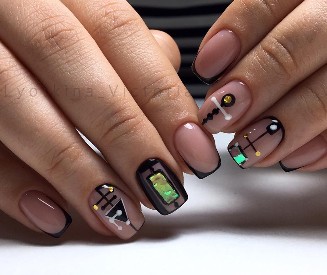 - Manucure avec des motifs géométriques sur fond noir. Ce peut être un petit triangle, une figure volumétrique, qui consistera en plusieurs lignes fines. Une telle option calme convient aux filles qui sont encore à l’école / à l’université. Depuis une telle manucure ne va pas attirer beaucoup d'attention.