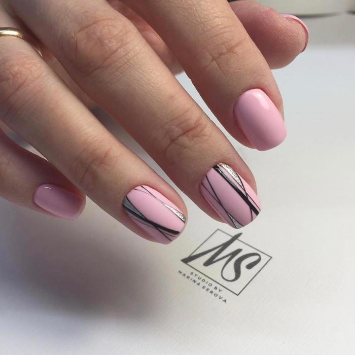 Il n’ya pas si longtemps, les ongles courts sont devenus à la mode, mais ils ont déjà réussi à gagner la sympathie de nombreuses femmes. Cela est dû au fait qu'une telle forme et longueur convient bien à toutes les tâches ménagères ou à un style de vie sportif. Vous devez admettre qu'il est très difficile d'imaginer une femme avec de longs ongles en forme de chats, qui pratique l'escalade, le yoga ou aime faire du kayak. La manucure rose-noire sur les ongles courts est très soignée et esthétique. Si vous ne souhaitez pas attirer beaucoup d’attention, mais que vous souhaitez tout de même mettre l’accent sur vos mains, veillez à choisir cette option.