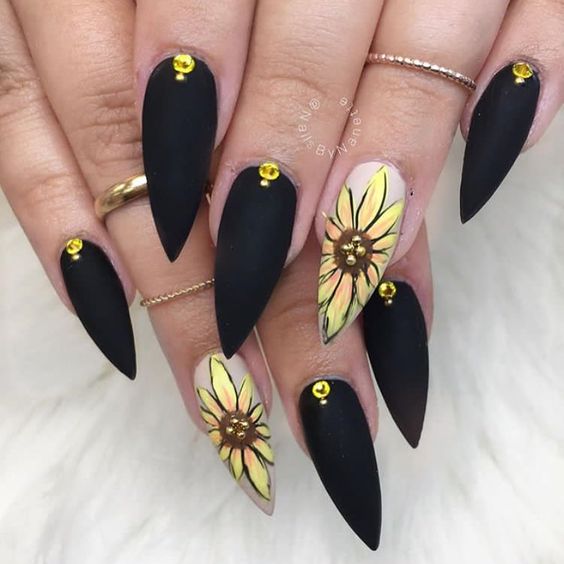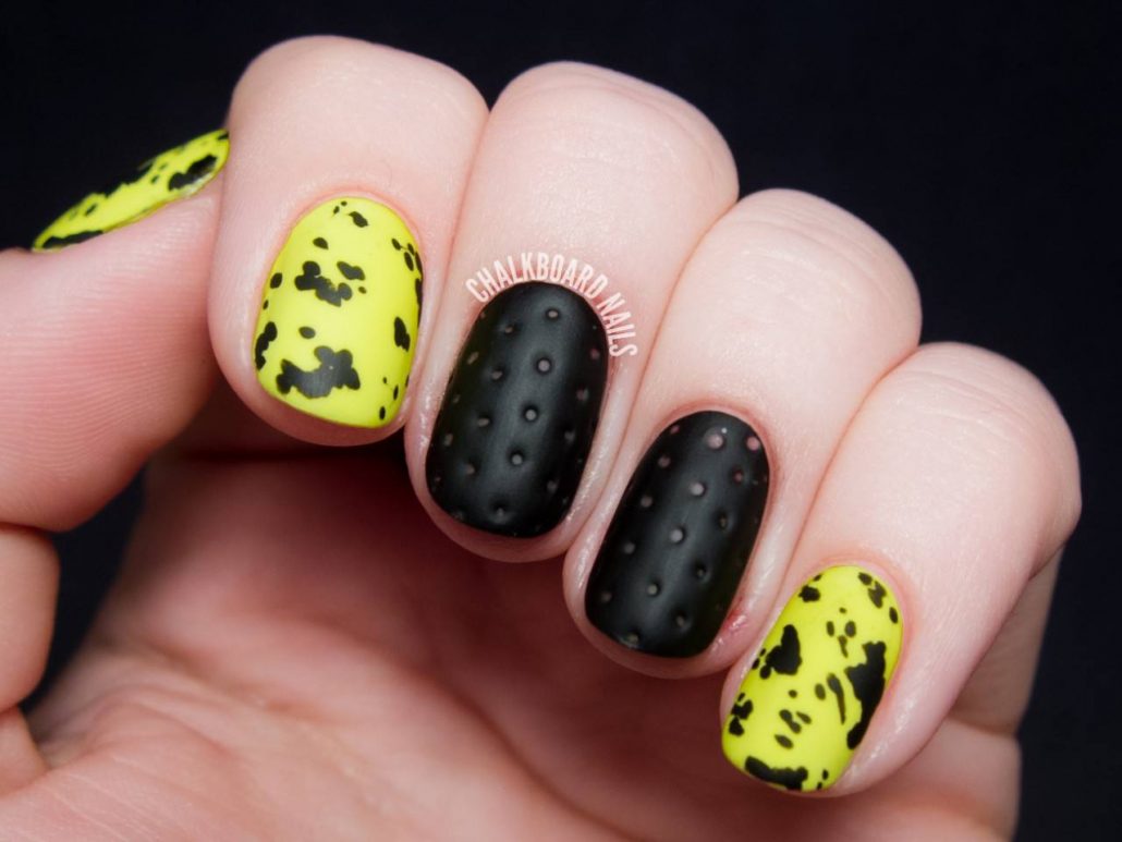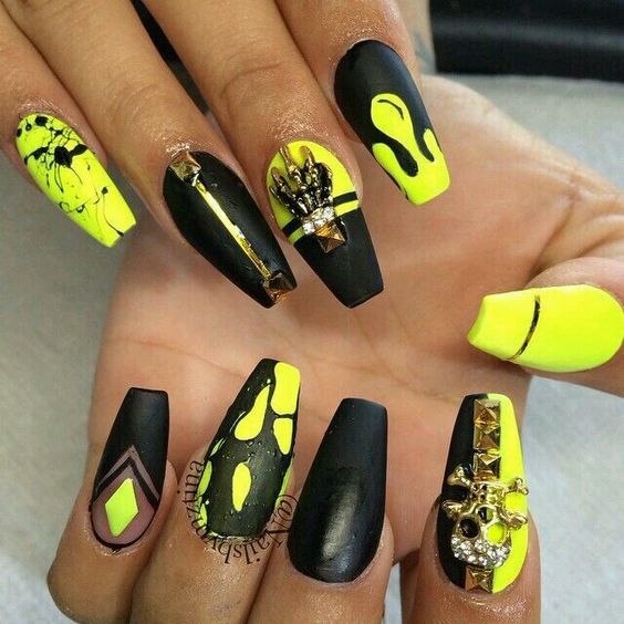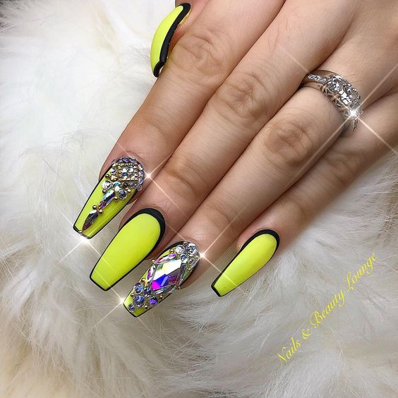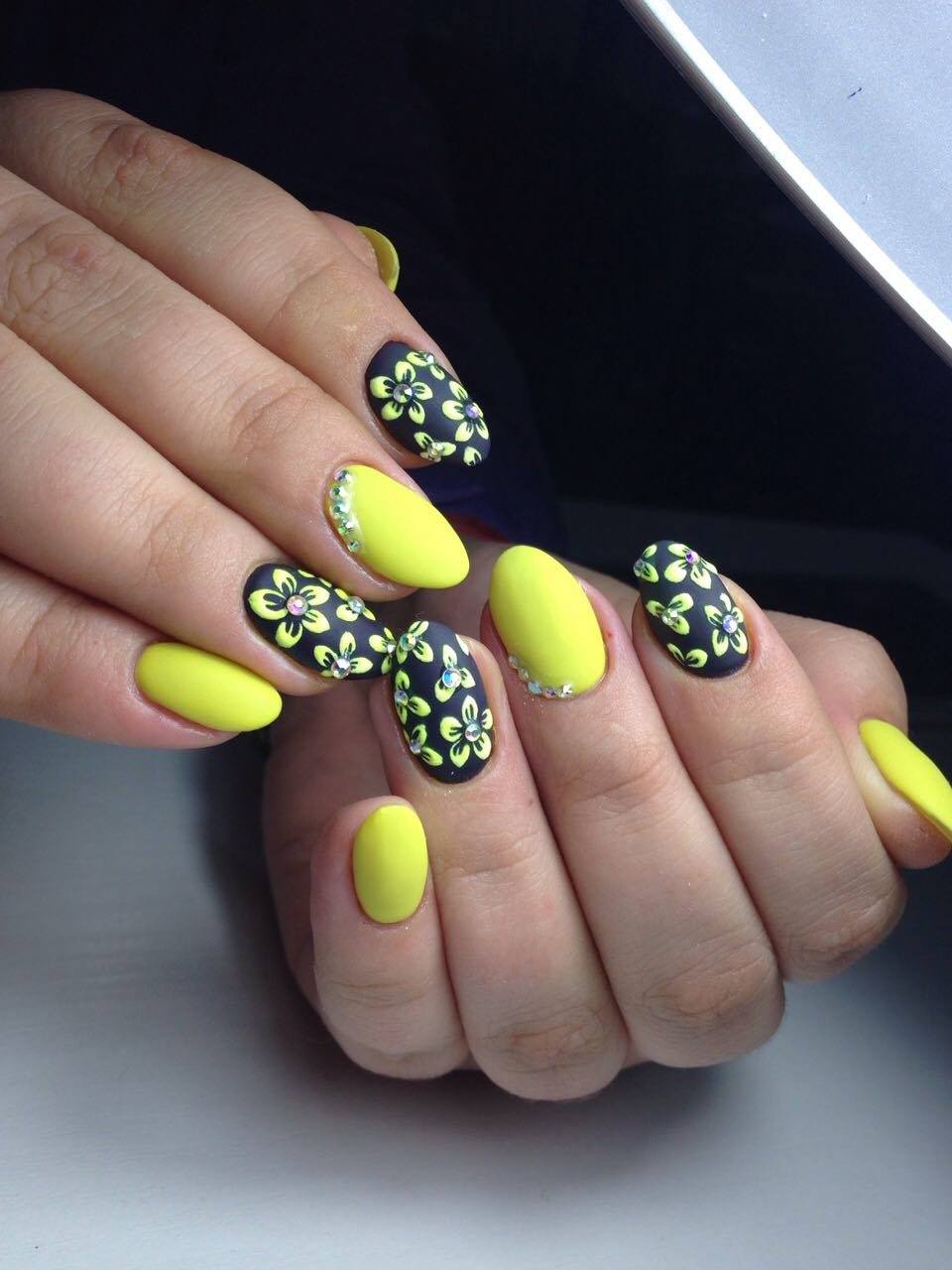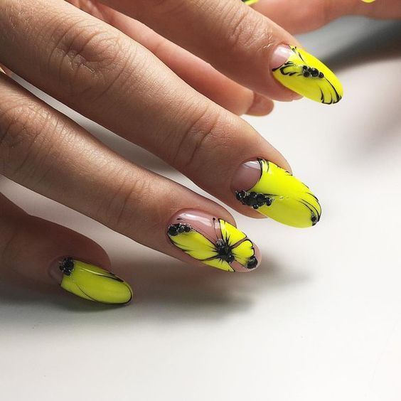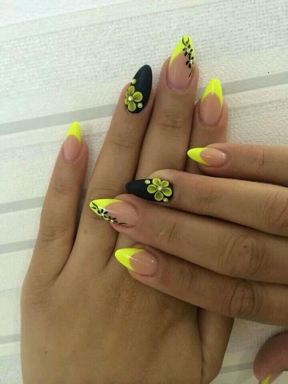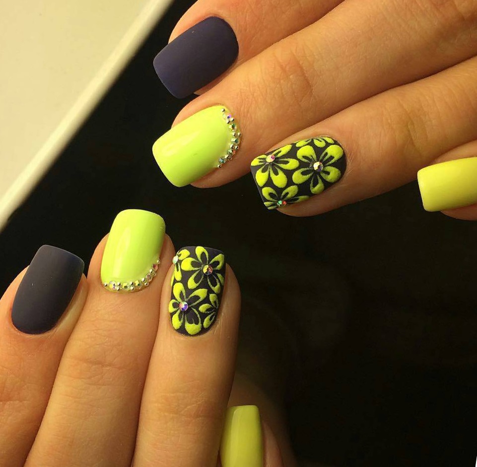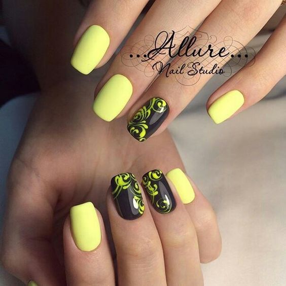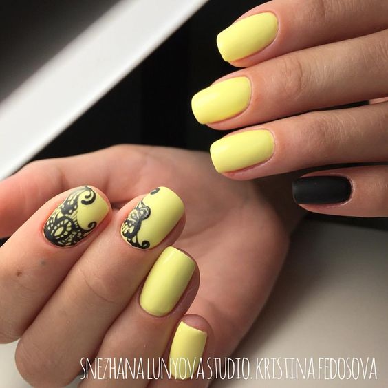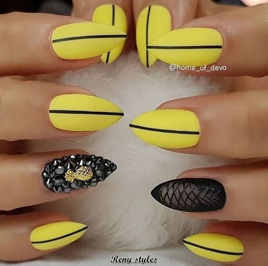 Très inhabituel, mais à la fois à la mode et élégant, il ressemble à une manucure jaune-noir avec un vernis mat. La combinaison de noir mat et de jaune brillant confère aux ongles un aspect tendance. Si vous ajoutez une quantité minimale de strass à cette conception, vous obtiendrez une manucure chic et efficace. Vous souhaitez obtenir un aspect doux et velouté de vos ongles, puis utilisez un vernis noir mat sur toute la surface, mais mettez en surbrillance un vernis jaune.