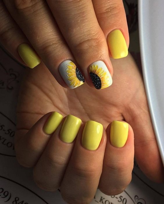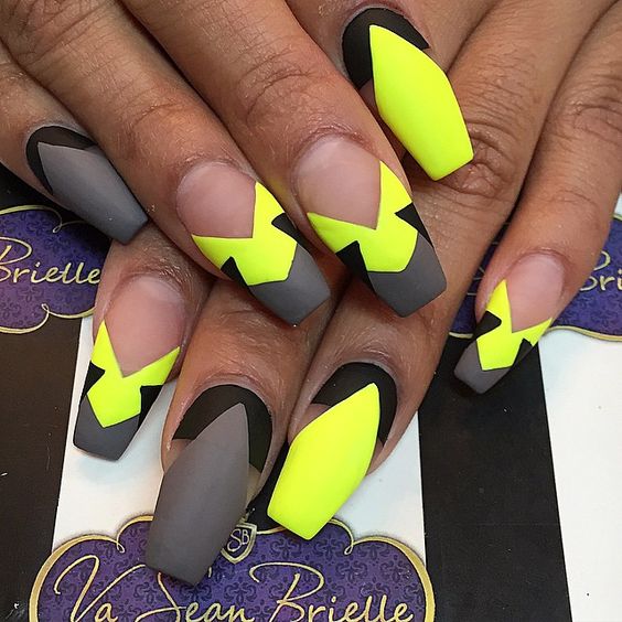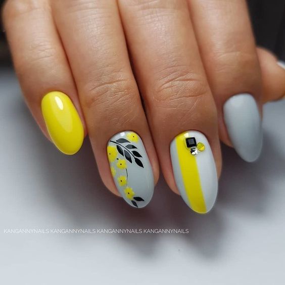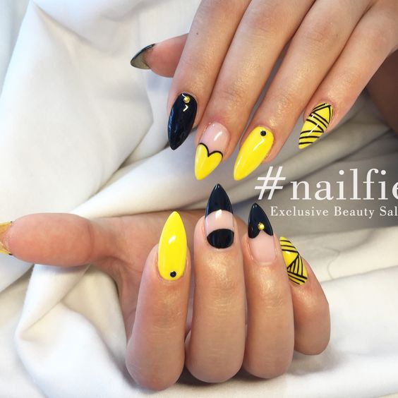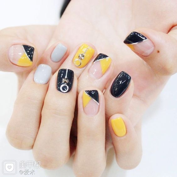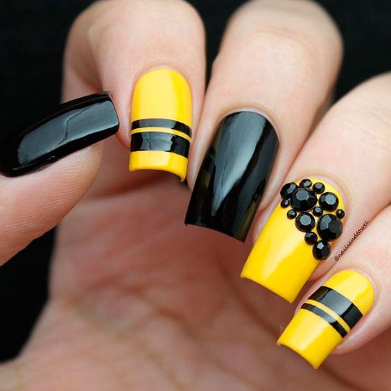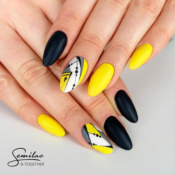 L'un des designs d'ongles modernes les plus en vogue reste la géométrie. Le motif géométrique en noir et jaune est éblouissant. Cela peut être un simple dessin utilisant des lignes ou un dessin complexe, avec l’application de carrés, de zigzags et de divers points. La combinaison de vernis noirs et jaunes avec d'autres couleurs peut ainsi dépasser toutes les attentes d'une manucure.