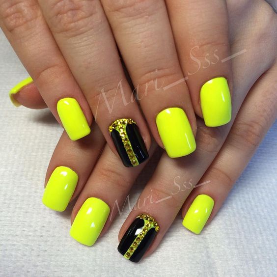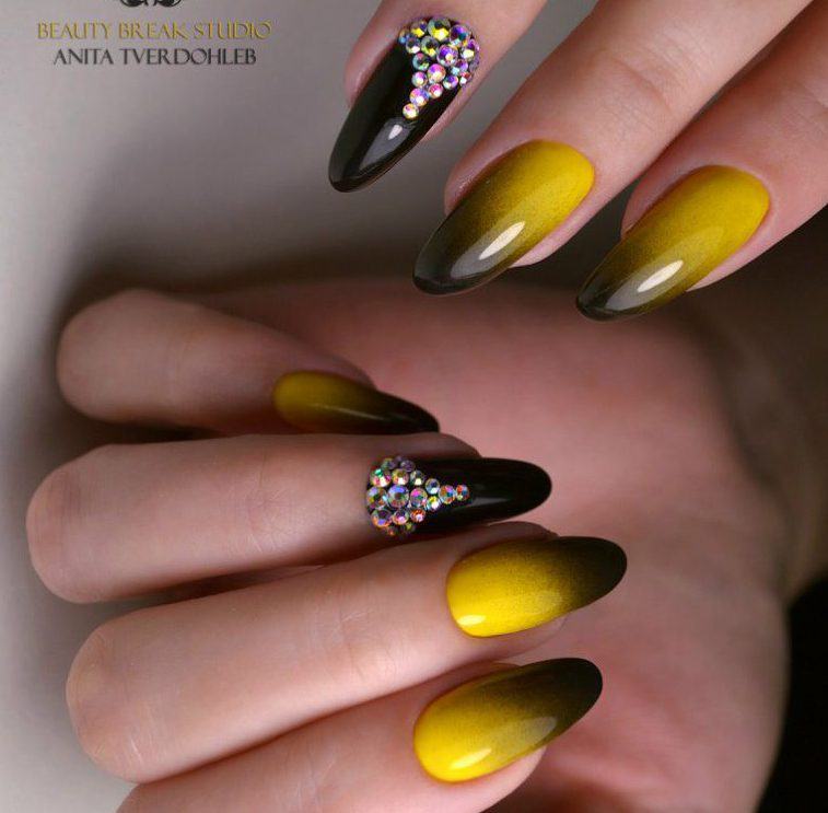 Manucure jaune-noir avec des strass
