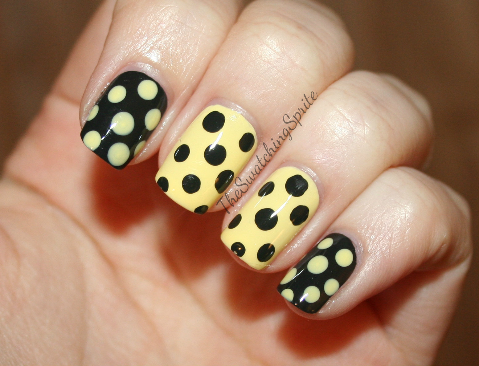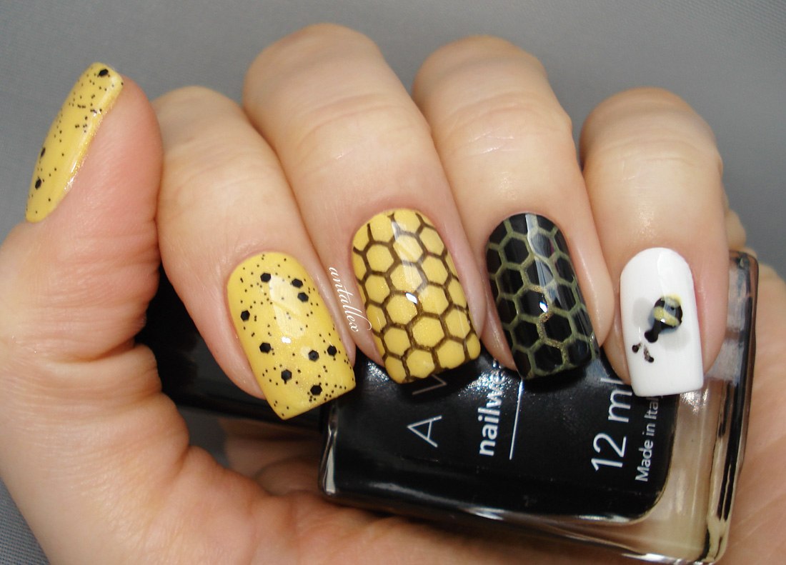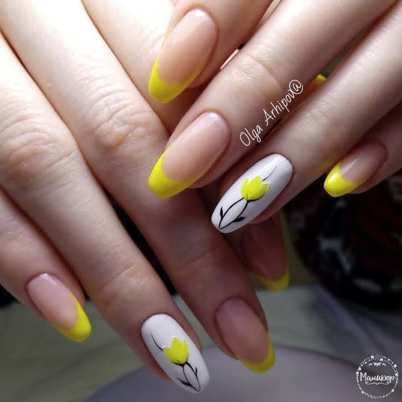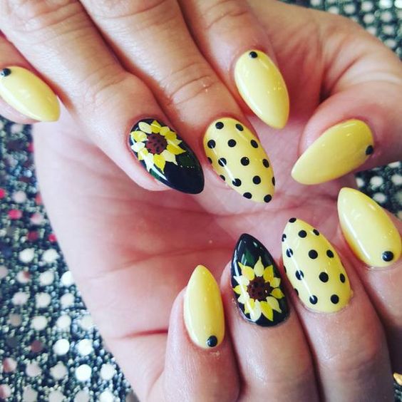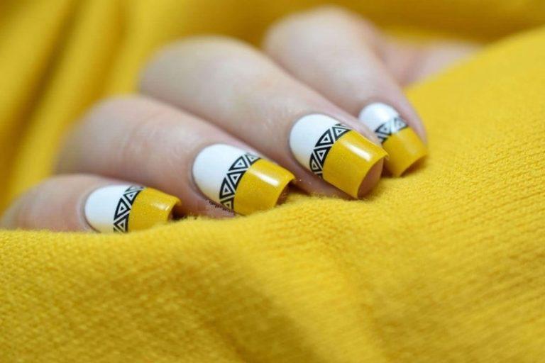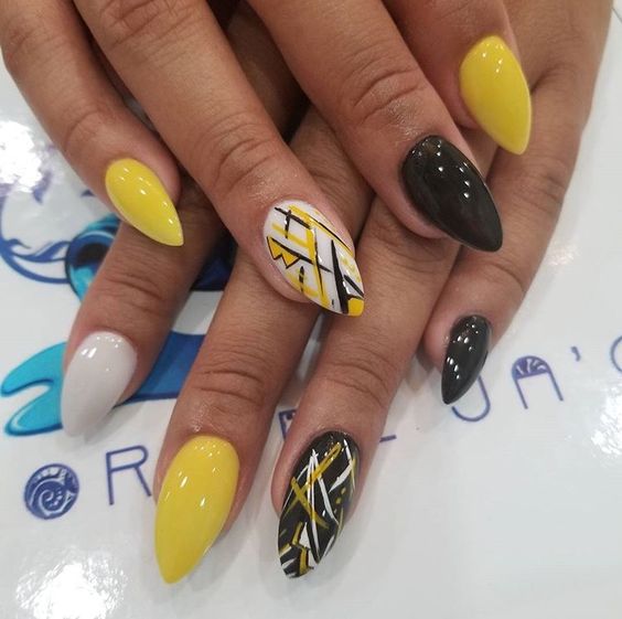 La combinaison de jaune, noir et blanc en manucure