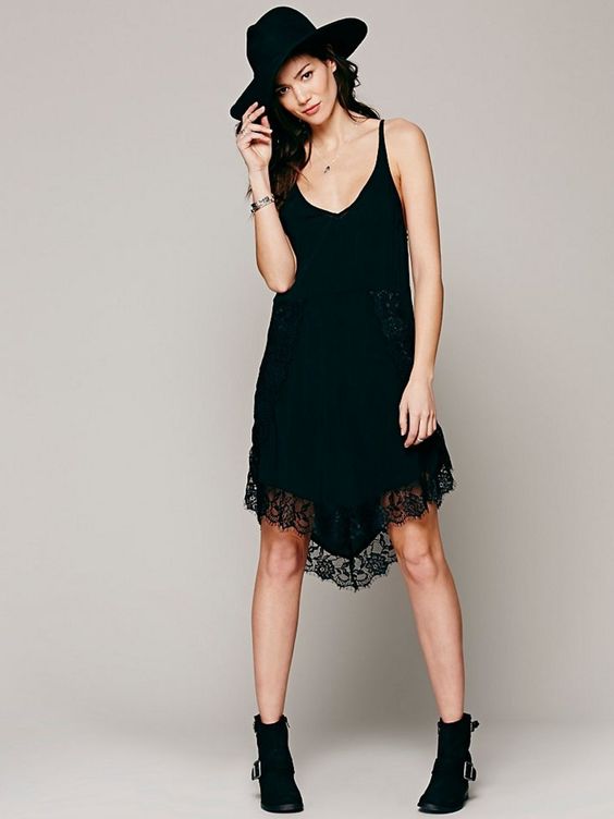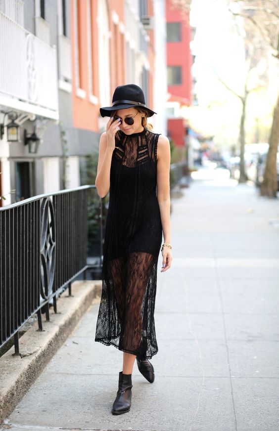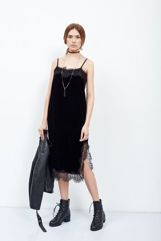 Pendant la saison froide, une robe noire peut facilement être combinée avec des chaussures brutes, telles que des bottes à lacets ou des bottes en cuir noires. En général, cette image est très inhabituelle, mais élégante en même temps. L'essentiel est de le compléter avec des accessoires appropriés. Pour un look plus romantique, choisis des bottes au-dessus du genou ou des bottes de laine. Ils sont toujours d'actualité cette année.
