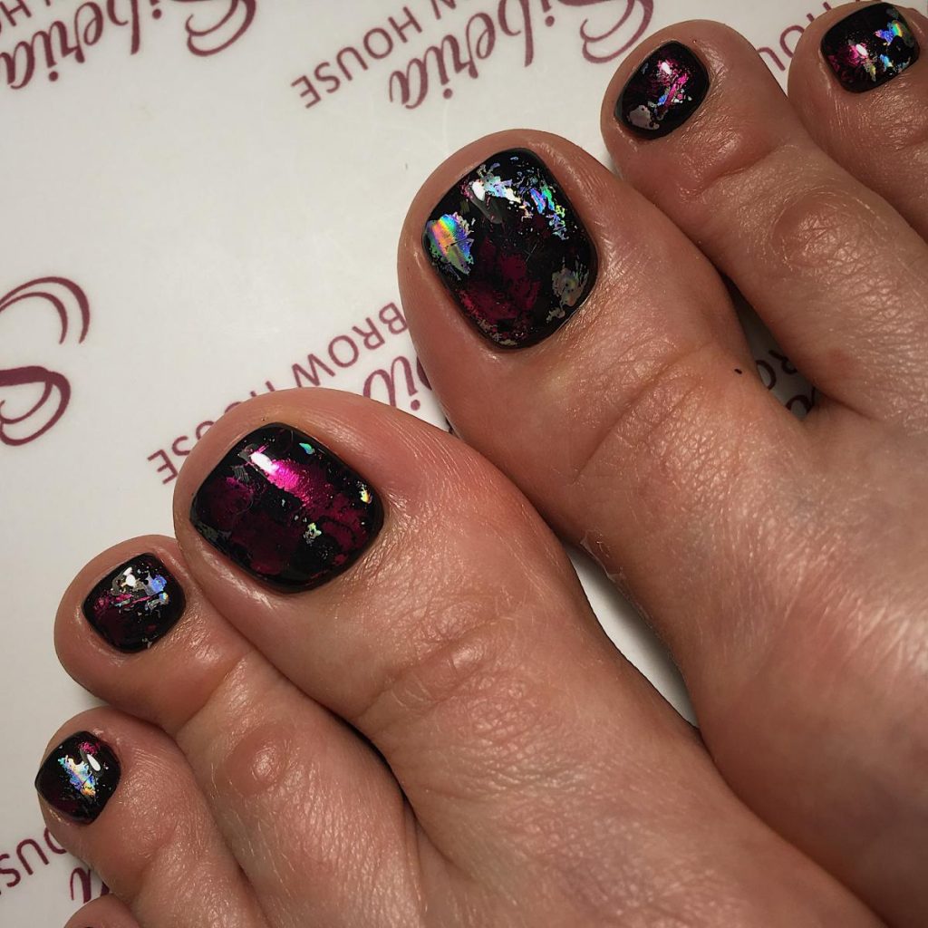 Pour créer une pédicure originale et facile à réaliser, vous devez choisir un vernis noir associé à une feuille. Après tout, les éléments brillants sont en parfaite harmonie avec le noir. Le papier d'aluminium peut être utilisé dans différentes couleurs. La conception de ce personnage est principalement réalisée sur les ongles du pouce et de l'index.