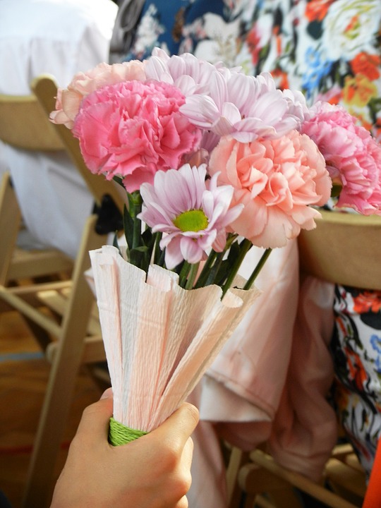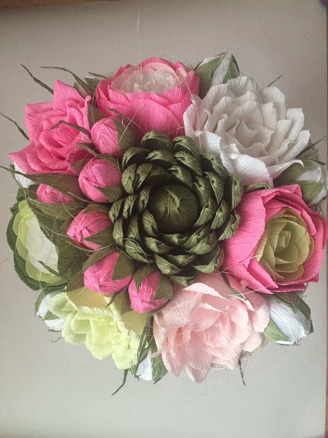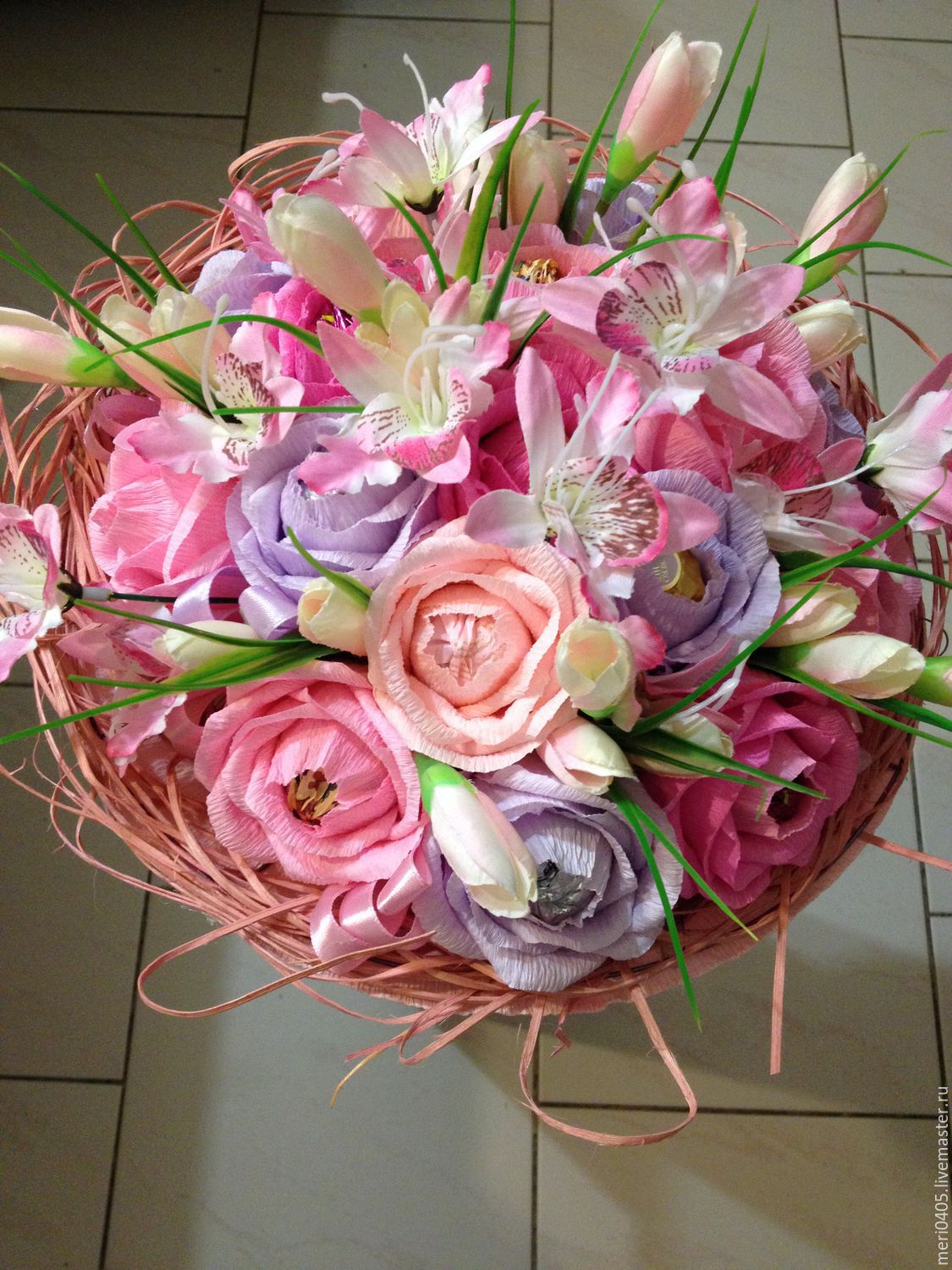 Mamie aimera certainement un bouquet aussi coloré et délicat. En le regardant, elle se souviendra de ses petits-enfants et se réjouira. Pour compléter le bouquet, nous devons prendre quelques petites boules et rentrer les pointes à l'intérieur pour que les boules ne se déroulent pas. Fixez le fil aux glomérules résultants. Maintenant, commençons à faire des fleurs avec du papier ondulé. Pour ce faire, nous devons couper le matériau en petits morceaux. À l'intérieur, nous aurons une boule de coton. Maintenant, attachez le centre au fil et formez les pétales. Enveloppez les tiges de toutes les fleurs reçues avec du papier vert. Les fleurs prêtes à l'emploi peuvent être emballées dans du papier, en formant un bouquet, ou vous pouvez l'habiller avec un ruban de satin.