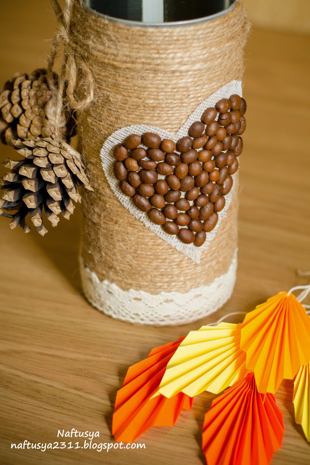 Le vase est très beau et inhabituel, et sa mise en œuvre ne nécessite pas beaucoup de temps. Grand-mère va certainement apprécier un tel cadeau et va l'admirer. Pour compléter le vase, nous avons besoin d'une grande tasse. En utilisant la colle du pistolet, fixez les tampons de coton autour du périmètre de la tasse entière et enveloppez-la de fils blancs pour mieux coller les disques à la surface de la tasse. Une fois le séchage terminé, peignez les disques en brun de manière à ce qu’aucun blanc ne soit visible à travers les grains de café. Une fois que la peinture est sèche, vous pouvez commencer à coller progressivement les grains avec un pistolet à colle. Essayez de placer les grains de café le plus près possible les uns des autres, de manière à ne pas laisser de trous.