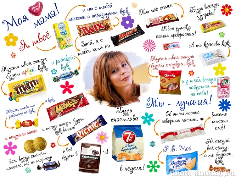 Un tel cadeau original fera sûrement fondre le cœur de chaque maman. Pour faire un cadeau, nous avons besoin d’un papier Whatman, de marqueurs multicolores, de tablettes de chocolat (Miracle, Bounty, Mars, Twix, chewing-gum menthe poivrée, Kinder), d’un pistolet à colle ou de la super colle transparente. Au centre de l'affiche, écrivez le titre en lettres capitales: "Maman, joyeux anniversaire." Maintenant, placez les bonbons dans un ordre aléatoire sur le papier whatman, collez-les avec de la colle et écrivez de jolis mots à côté, par exemple: comme c'est cool que je sois à vous (gentil), nous en avons juste un (barre miracle). Le lettrage peut être inventé par vous-même. Une affiche toute faite devrait être placée le matin dans la cuisine, créant ainsi une surprise inattendue pour maman le jour de son anniversaire. Une telle félicitation encouragera certainement la fille anniversaire pour toute la journée.