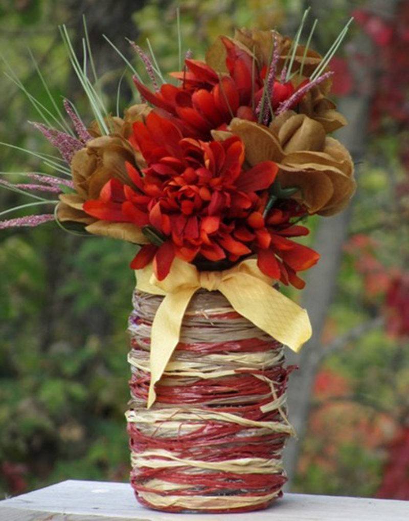 Pour faire un tel cadeau, nous avons besoin de fils de laine de toutes les couleurs et d’une bouteille. Tout d’abord, appliquez de la colle PVA sur le flacon avec un pinceau et enveloppez-la avec du fil. Après séchage, vous pouvez décorer le vase avec un ruban de satin et attacher une carte avec des voeux pour maman sur une corde.