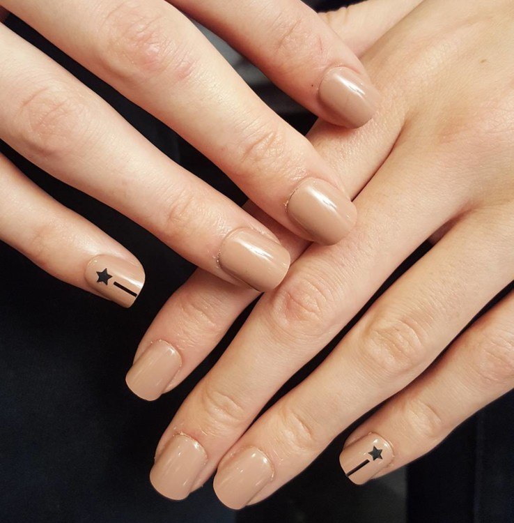 Shellac, malgré son aspect pratique, exige du maître une attention et une tactique de travail accrues. Les débutants travaillant avec la gomme laque peuvent pratiquer des manucures minimalistes. Pendant très longtemps, la paume de la manucure à gomme laque a été occupée par un filet sous la forme de lignes de différentes épaisseurs. Ensuite, cette conception a cédé la place à de petites fleurs. Et aujourd'hui, des imprimés minimalistes sous forme de points simples, de rayures et d'autres figures simples sont pertinents. Le minimalisme techniquement exécuté sous forme d'abstraction graphique, d'oiseaux ou de fleurs sur une base nue est la tendance de 2026 dans le monde de la manucure d'entreprise.