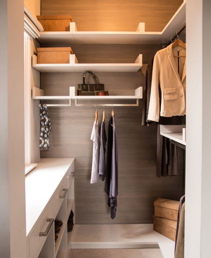 Avant d'installer des meubles dans le vestiaire, la pièce doit être préparée. Tout d'abord, il devrait être sec, vous devez donc créer une ventilation. Il est déconseillé de créer une salle de stockage dans le coin du bâtiment, qui a tendance à être mouillé et n’est pas éclairé par la lumière du soleil. Il n'est pas souhaitable qu'il y ait un mur commun avec la cuisine et la salle de bain. S'il n'y a pas de fenêtres, vous pouvez installer un ventilateur capable de s'allumer automatiquement après un certain temps.
