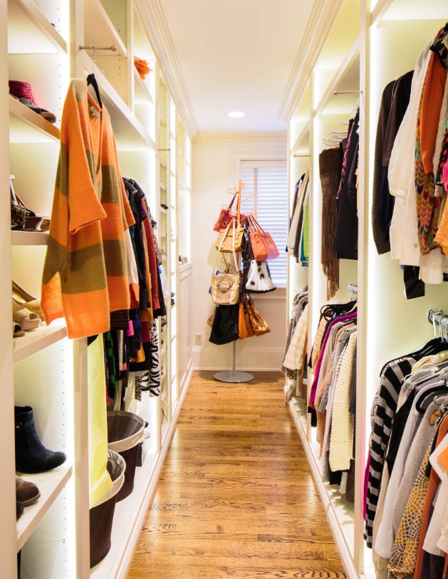 Pour faciliter la recherche de la bonne chose, dans le vestiaire, vous devez disposer d’un éclairage de haute qualité. Les lampes à lumière chaude ou neutre sont parfaites. Les spots à LED montés sur des étagères ne seront pas superflus ici. Les luminaires classiques peuvent être remplacés par de petits projecteurs pouvant être orientés dans n'importe quelle direction.