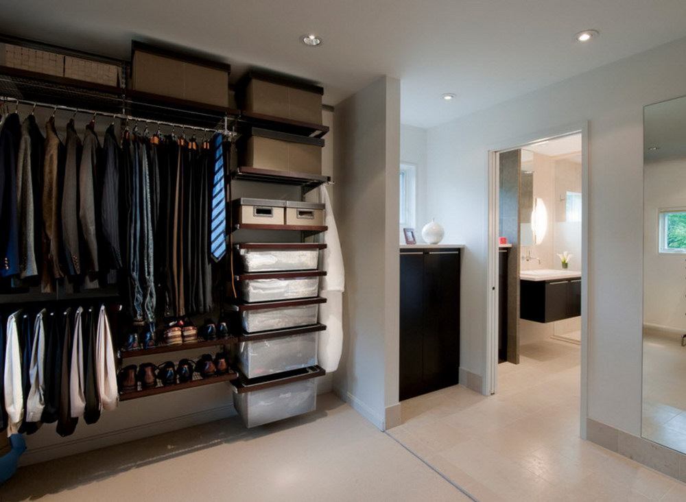 Dans la maison où le dressing n’était pas conçu à l’origine, il est plus facile de l’équiper dans la chambre à coucher. Pour ce faire, un petit espace est séparé par un mur ou des portes coulissantes. Même une étagère avec couloir ou une armoire haute peuvent assumer ce rôle.