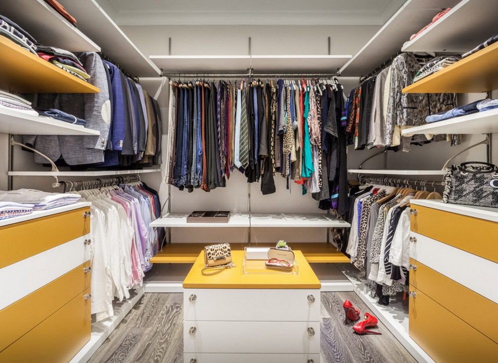 Cette option de disposition peut être appelée optimale pour un grand dressing. Il est beaucoup plus pratique d’utiliser les parties latérales si la longueur de la partie centrale est d’au moins 1,5 m. Vous y trouverez également une chaise, une planche à repasser et un miroir.