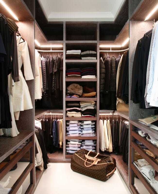 Un tel dressing peut être placé dans des pièces de petite superficie. Grâce au placement perpendiculaire des systèmes de stockage, vous pouvez stocker deux fois plus d'objets que dans une armoire classique.Les portes coulissantes sont utilisées pour séparer le dressing. Si la pièce a une hauteur importante, il est permis d’utiliser des écrans, des rideaux ou des cloisons avec une ouverture pour une porte en contreplaqué ou en gypse.