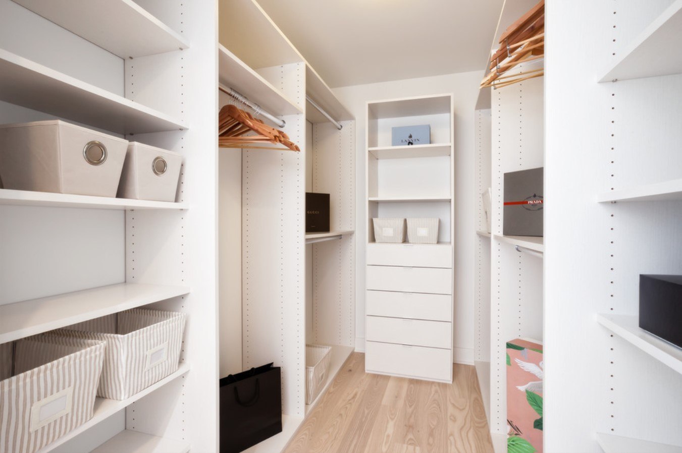 La partie supérieure du vestiaire est généralement conçue pour stocker des couvertures, des oreillers, des sacs et des articles de saison. Les parapluies, les gants, les chapeaux et les sacs peuvent être rangés légèrement au-dessus du niveau des yeux. La partie centrale est occupée par des étagères et des cintres sous lesquels sont installées des boîtes à vêtements. Le niveau inférieur sera occupé par des chaussures. Il est plus pratique de le stocker sur des structures en rotation ou sur des étagères, dont l’angle est compris entre 45 et 60 degrés.