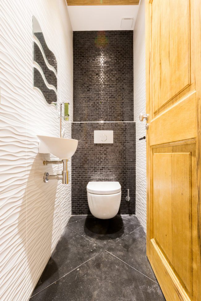 Pour une petite toilette, la pierre décorative, le papier peint en vinyle, la céramique émaillée, les panneaux en bois / plastique deviendront un revêtement pratique et original. Lors de la conception, il convient de privilégier les tons calmes (gris, bleu, blanc, beige, sable), associant des couleurs neutres et lumineuses - vert avec vert clair, blanc avec noir, gris avec blanc. Une solution aussi simple élargira visuellement l'espace.