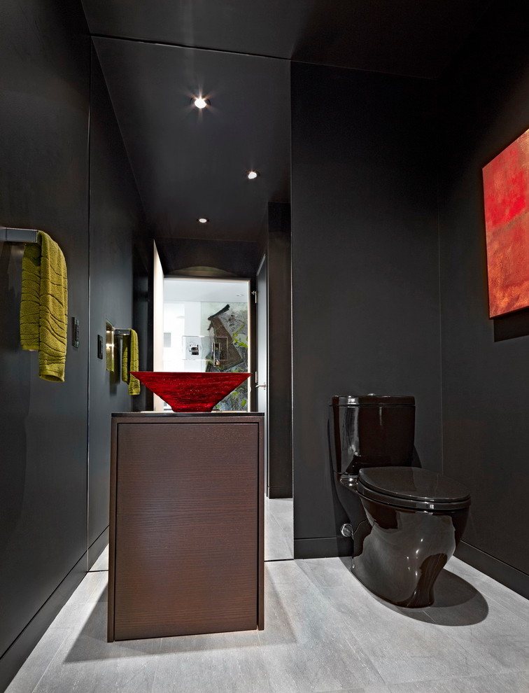 Les nuances de café semblent chères et élégantes dans la conception des toilettes. Mais tout devrait être une mesure. Cette couleur est parfaite en combinaison avec une plomberie blanche comme neige, des éléments de décoration en bois et en métal.Il est possible de créer un style spécial de la salle de bain en combinant harmonieusement les contrastes.