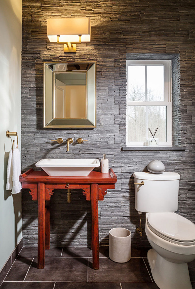Pour une petite toilette, le confort et la simplicité fonctionnelle sont considérés comme la combinaison idéale. Le minimalisme accueille les contrastes de lumière des nuances sombres et claires, les matériaux naturels pour la décoration (pierre, bois, verre), l’absence de décorations volumineuses. Ils peuvent être remplacés par des panneaux au plafond et des lampes compactes décoratives.