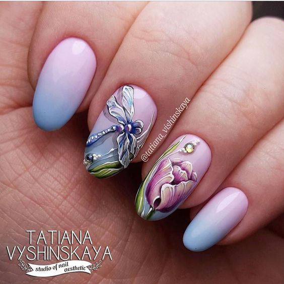Motifs floraux, cadeaux divers, visages de filles, inscriptions et images simples, drôles de petits animaux - ce n'est pas toute la liste de ce que vous pouvez représenter sur vos pieds au printemps 2026. C'est une telle manucure avec une image qui ne sera jamais ennuyeuse et quotidienne. Bien au contraire, une telle manucure printanière est immédiatement remarquée. Il rive ses yeux sur les doigts bien coiffés de gentilles dames. La peinture peut être une excellente solution pour la décoration de vos ongles - c'est une approche populaire pour créer des impressions fraîches sur les ongles à l'aide de peintures acryliques et d'un pinceau. Pour ce faire, les ongles sont d'abord recouverts de vernis colorés, puis le maître peut dessiner la photo de votre choix. Et, bien sûr, vous pouvez ajouter un petit décor à une telle manucure.
